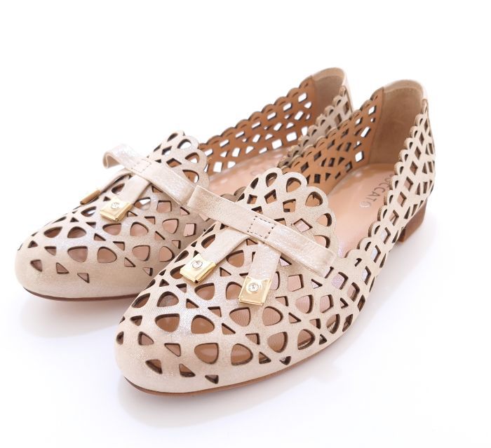 - Złote ażurowe lordsy ze skóry, na płaskiej podeszwie.