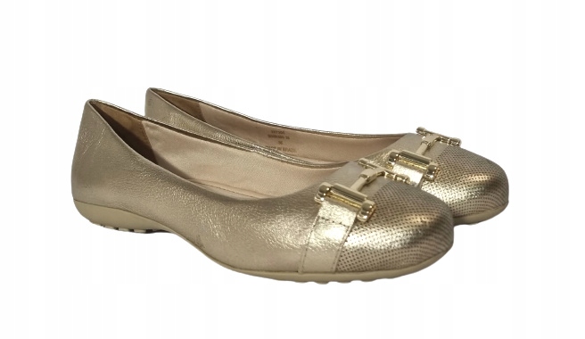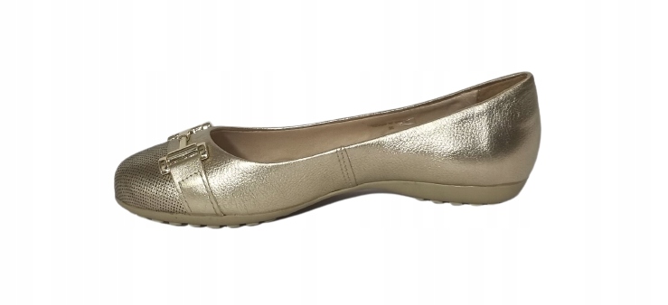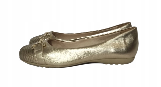Wygodne baleriny w kolorze złotym. Wykonane zostały ze skóry naturalnej. Wkładka wykonana jest z tkaniny. Baleriny mają płaską podeszwę o wysokości 1,5 cm. Podeszwa została wykonana z wysokogatunkowego tworzywa. Model zyskuje wdzięk dzięki ozdobie umiejscowionej z przodu baleriny.