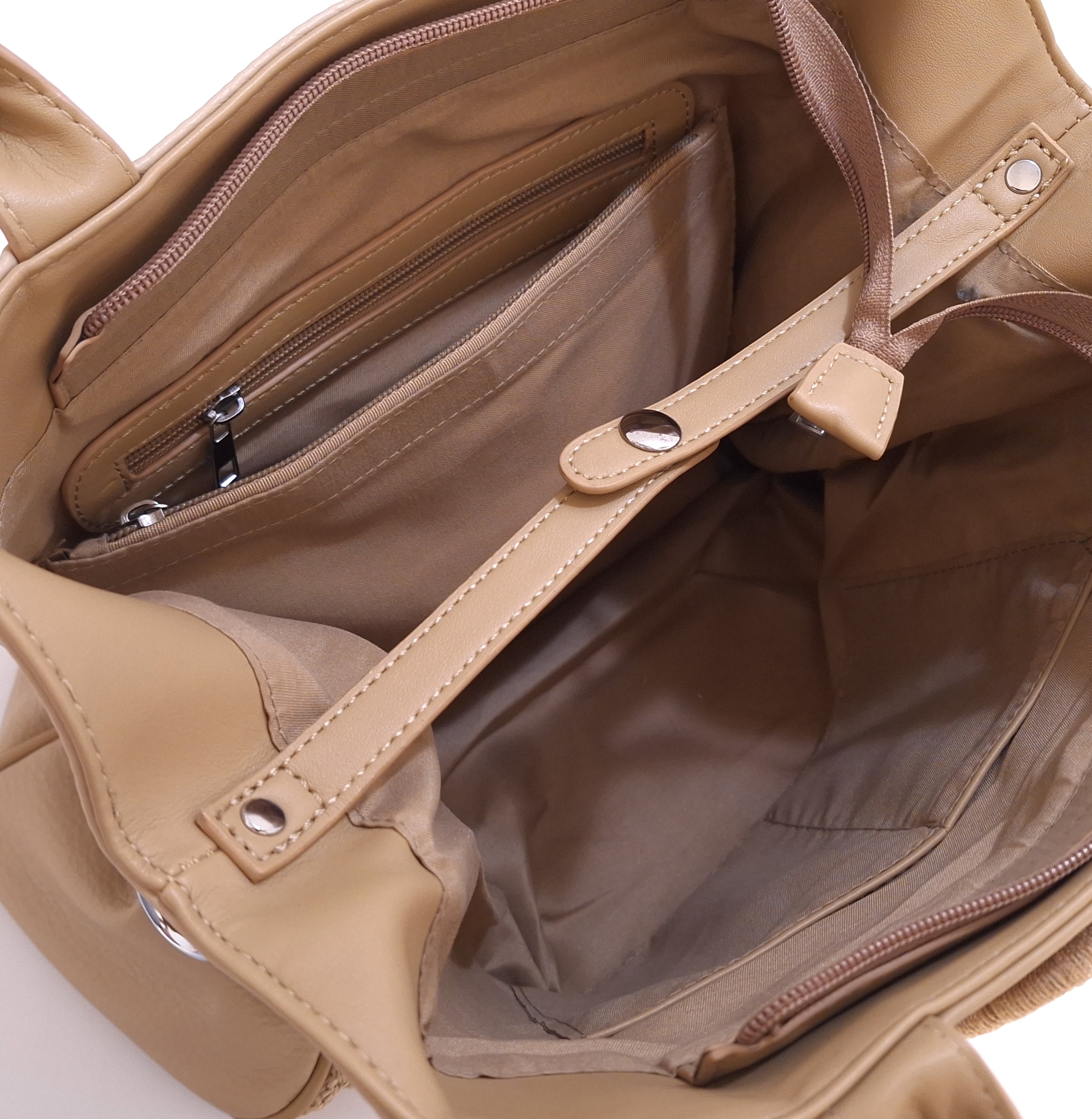 - Damska torebka w beżowym kolorze, wykonana z ekologicznej skóry. Model jednokomorowy.