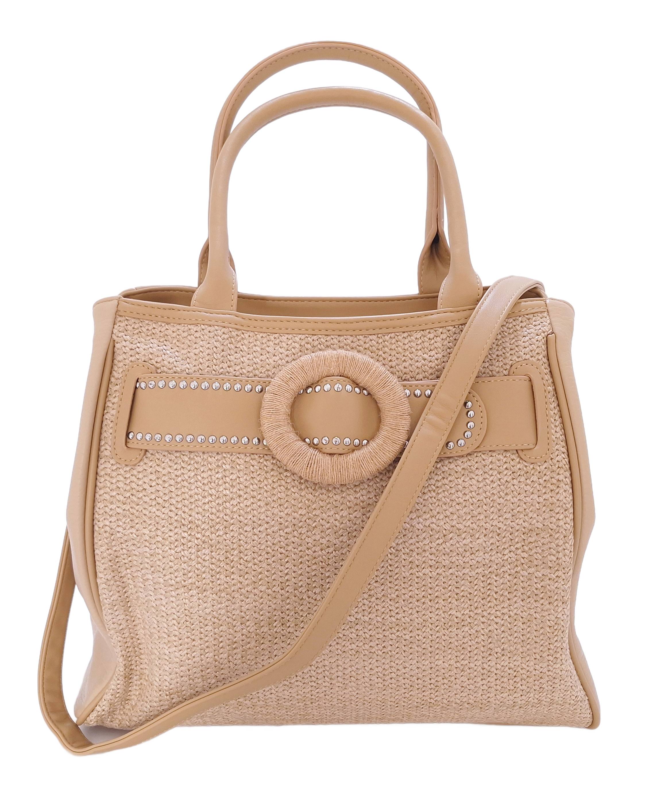 Klasyczna damska torebka marki Maria C beżowym kolorze. Torebka posiada główna komorę na zamek błyskawiczny. Przez środek torebki przechodzi rozpinany pasek.Dzięki niemu możesz zwężyć lub poszerzyć górną część torebki. Prosty design uzupełniają dwie ergonomiczne rączki idealne do noszenia w dłoni oraz odpinany pasek na ramię. Przód wykonany z syntetycznego materiału o plecionej fakturze nadaje jej elegancji i subtelnej tekstury, podczas gdy tylna część i boki zostały uszyte z ekologicznej skóry. Stylowy detal w postaci ozdobnego paska z dżetami oraz dekoracyjnego kółka oplecionego sznurkiem przyciąga spojrzenia i dodaje całości unikalnego stylu.