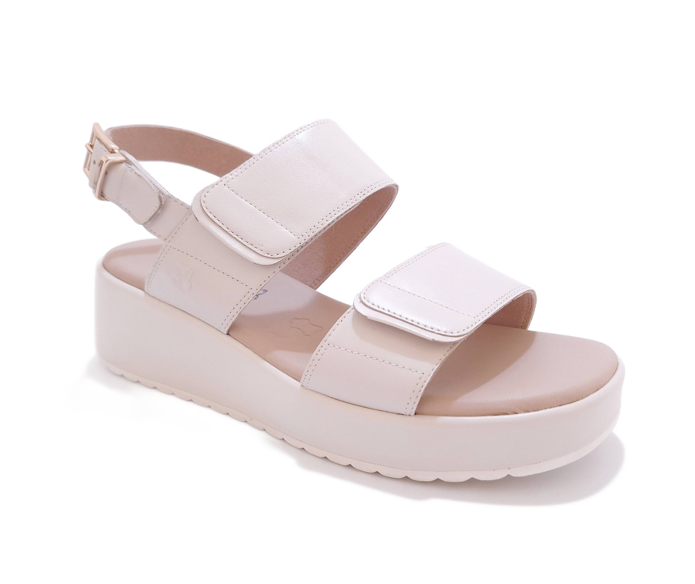 • Wygodne sandały damskie na platformie w beżowym kolorze wykonane ze skóry naturalnej licowej. Regulowane na rzepy. Idealne na lato i codzienne stylizacje.