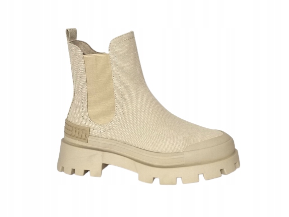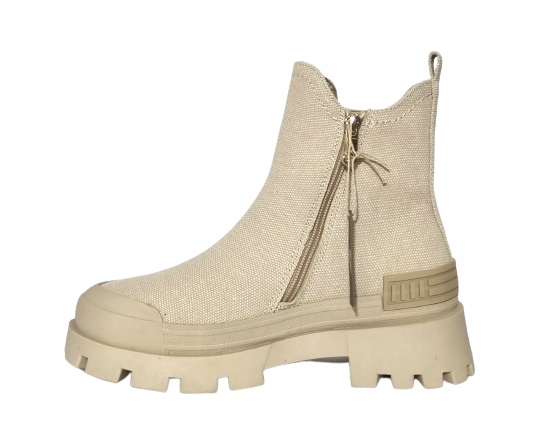 - Damskie botki typu sztyblety wykonane z tkaniny w beżowym kolorze. Model wyposażony w suwak.
