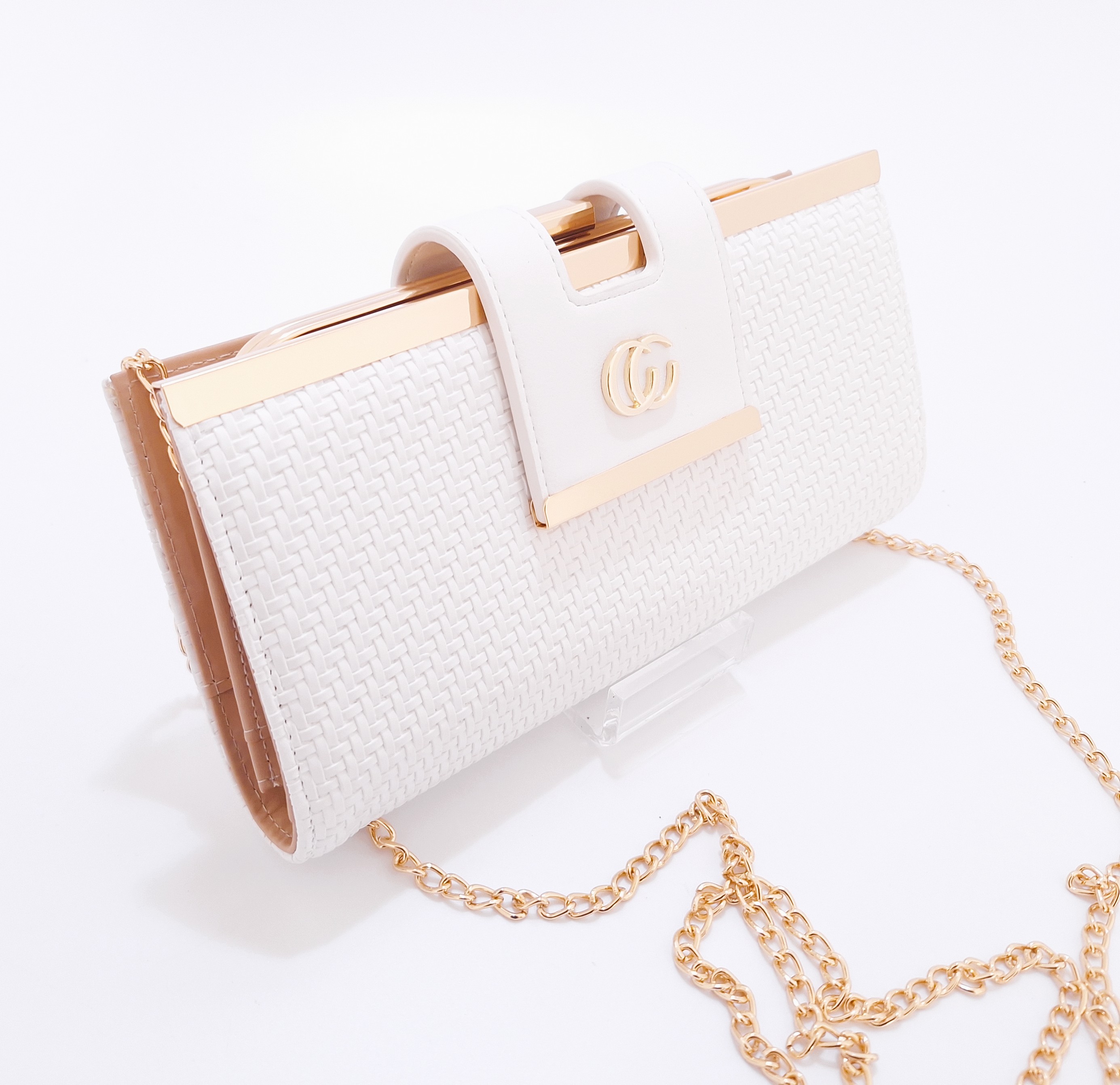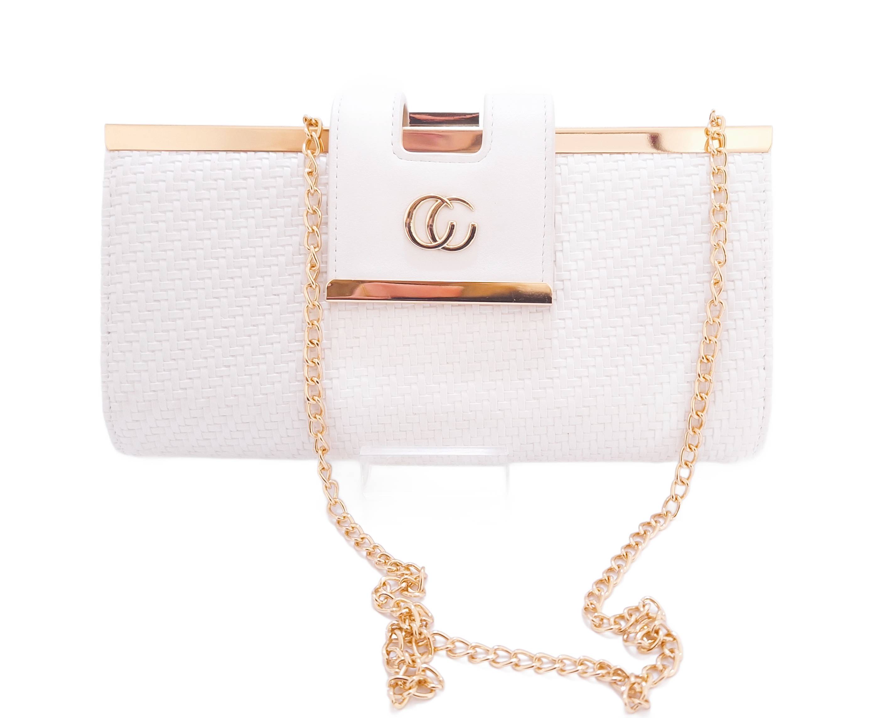 - Biała wizytowa torebka na łańcuszku zapinana na zatrzask. Ten fason to idealnie dopełnienie wieczorowej stylizacji.