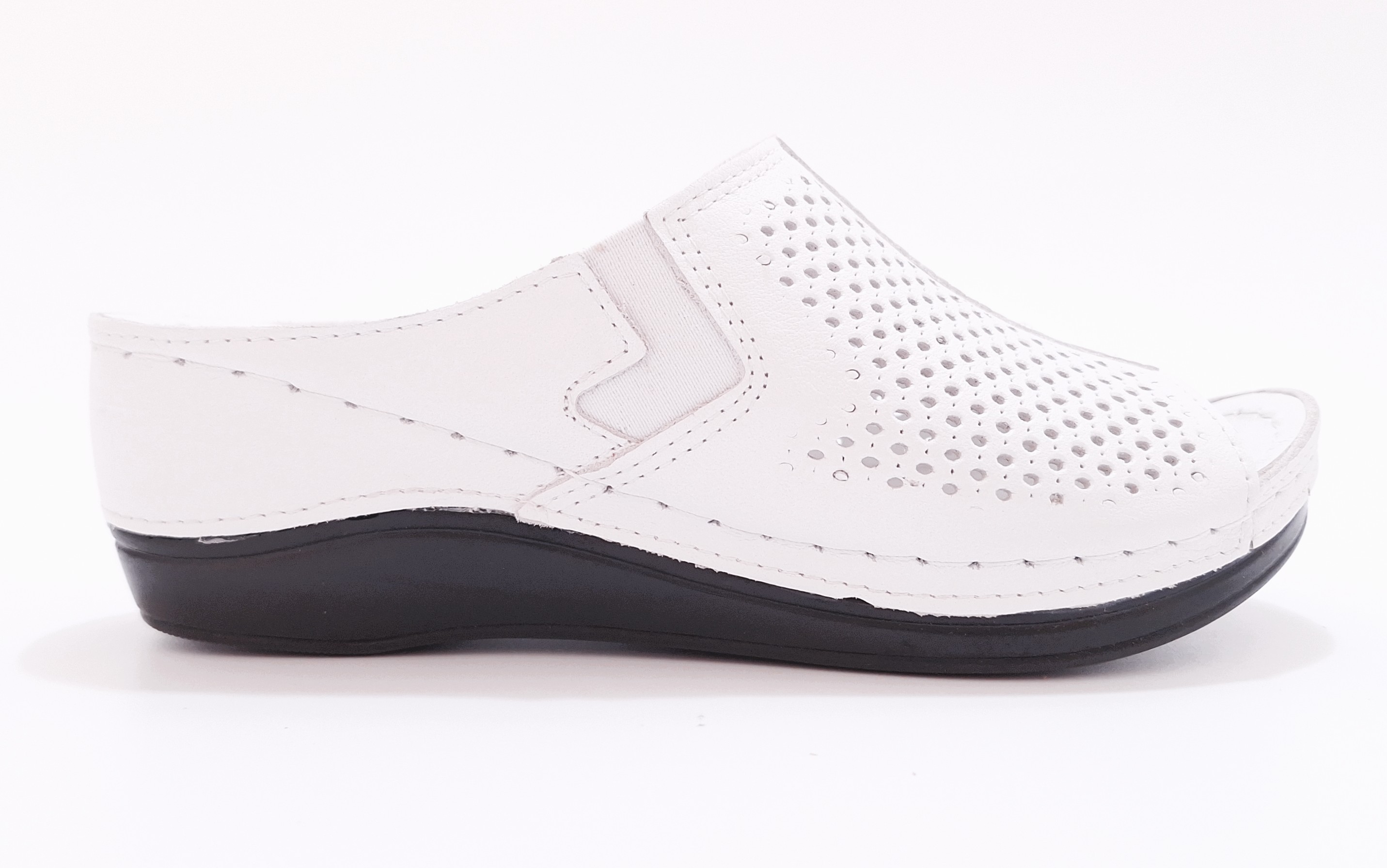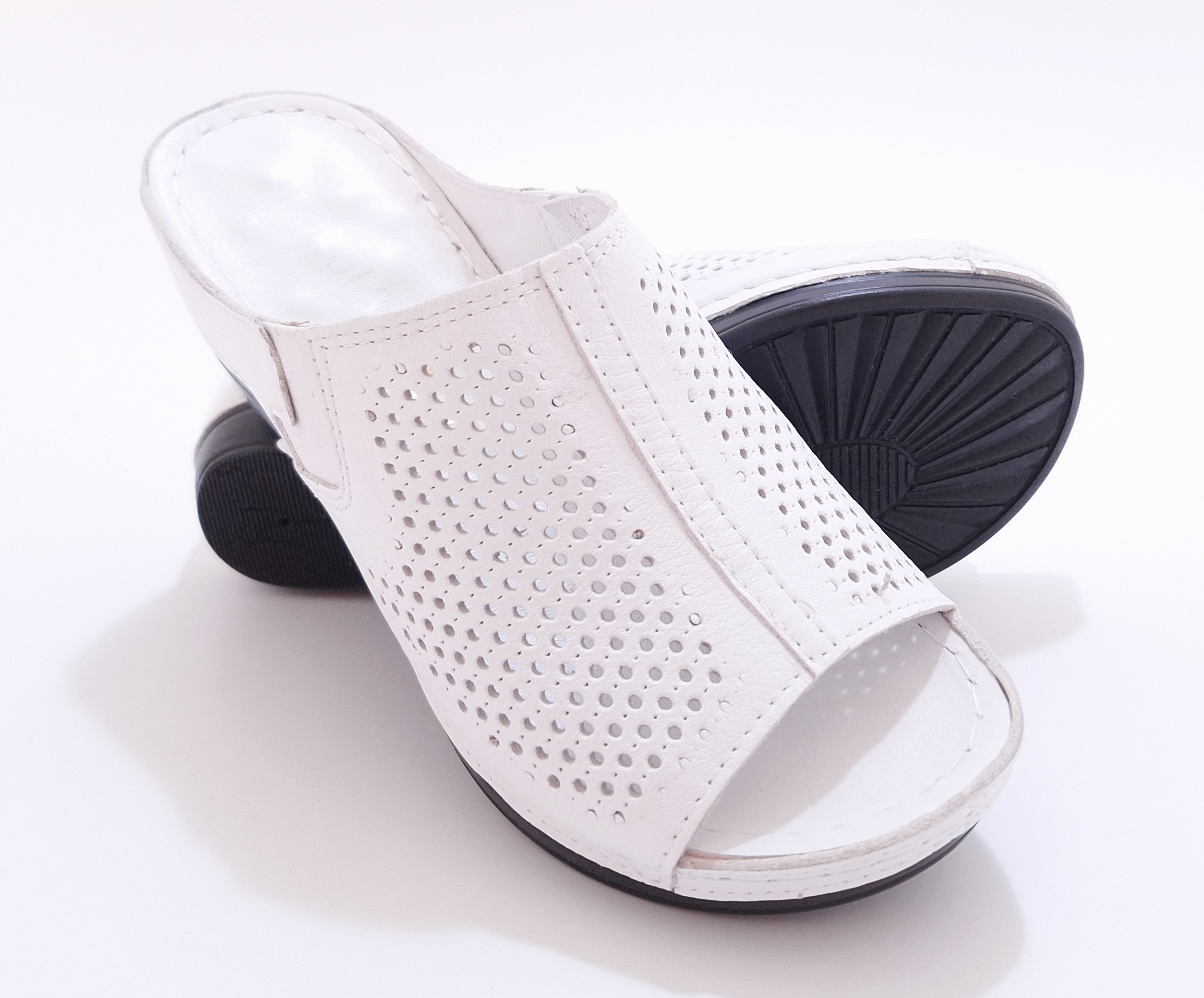 - Klapki damskie na koturnie wykonane z miękkiej skóry naturalnej, z ażurową cholewką i elastycznymi wstawkami.