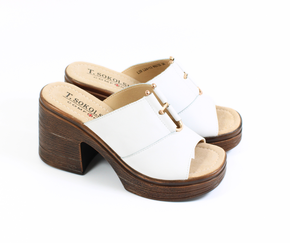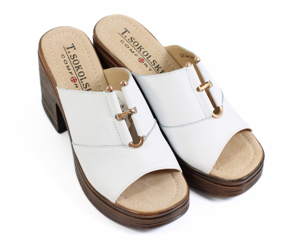 Szukasz idealnego obuwia na letnie dni, które zapewni Ci zarówno komfort, jak i styl? Mamy dla Ciebie propozycję, która z pewnością Cię zachwyci! Damskie klapki na szerokim obcasie marki T.Sokolski wykonane z naturalnej skóry w kolorze białym to must-have w garderobie każdej modnej kobiety. Miękka skórzana wkładka zapewnia wysoki komfort dla stóp. Klapki osadzono na podeszwie mierzącej 3 cm oraz na szerokim, masywnym stabilnym słupku o wysokości 9 cm, co zapewnia stabilność i amortyzacje podczas chodzenia. Pomimo masywnego wyglądu klapki są niezwykle lekkie.