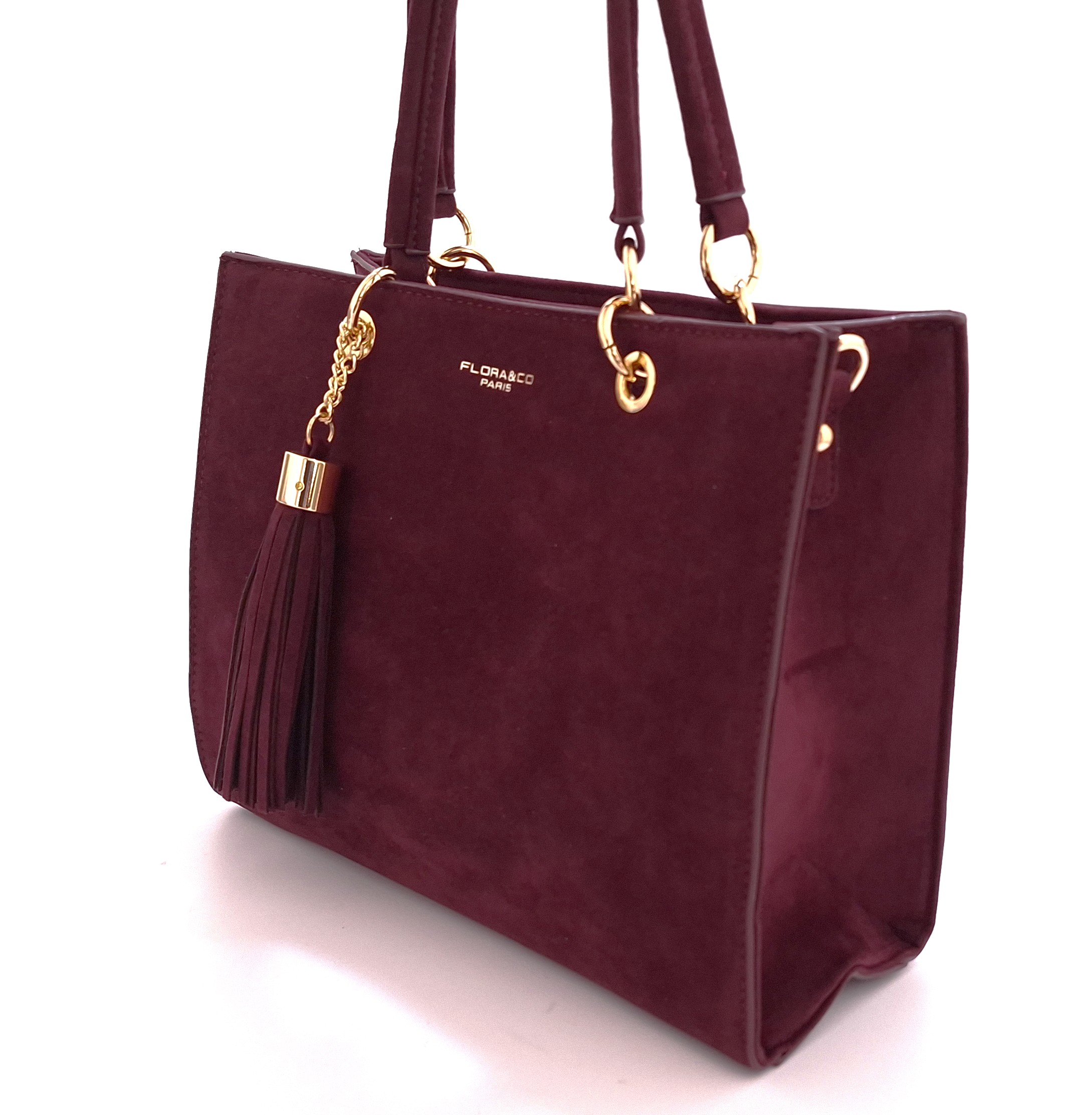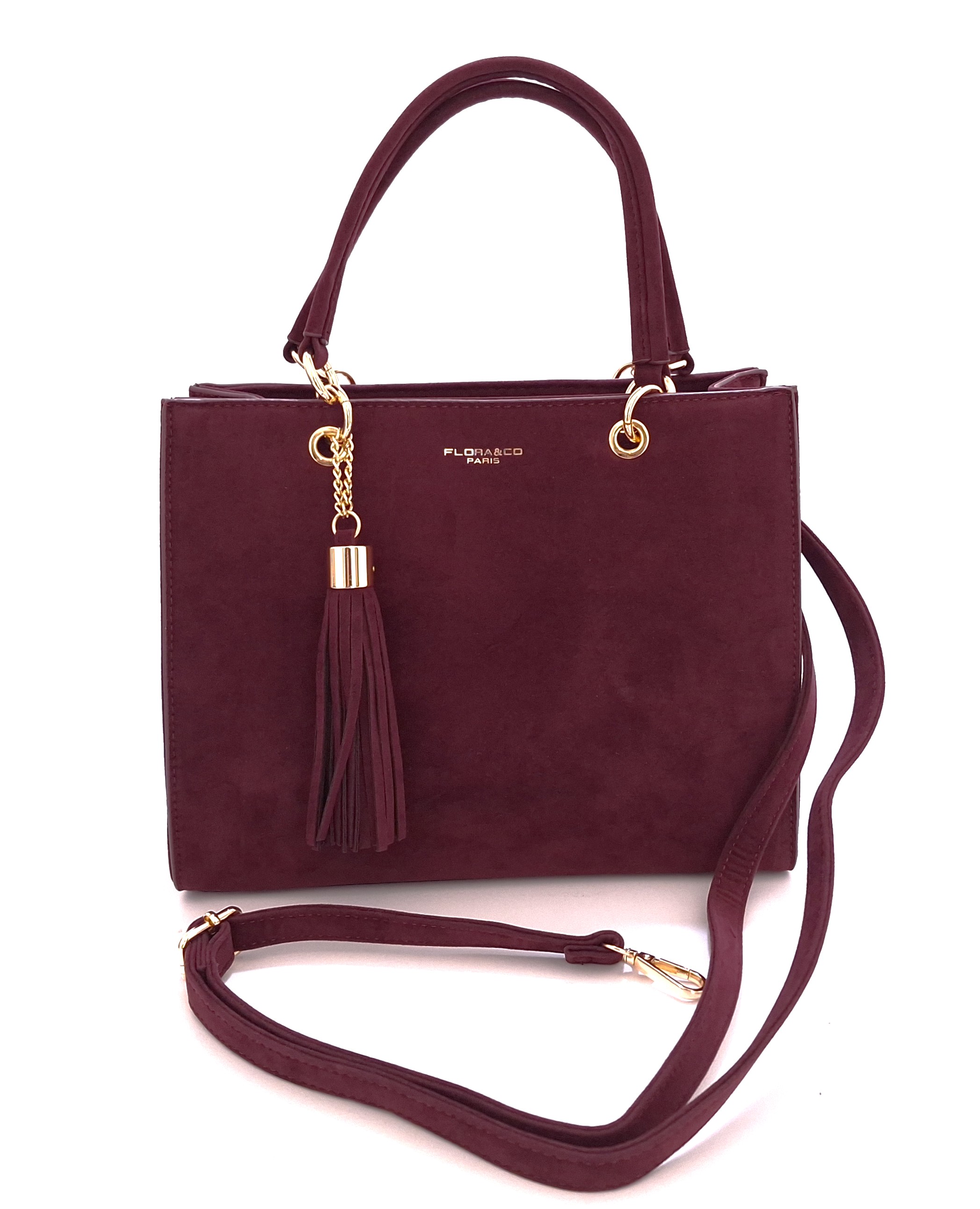 Bordowa torebka damska marki Flora&Co wykonana z ekologicznej skóry zamszowej to stylowy dodatek dla kobiet ceniących styl i funkcjonalność. Model posiada dwa uchwyty oraz odpinany i regulowany pasek, dzięki czemu można nosić ją w dłoni, na ramieniu lub przez ramię. Uwagę zwraca ozdobny breloczek w postaci chwosta. Spód torebki chronią metalowe nóżki. Torebkę można nosić zarówno ze stylizacjami casualowymi, jak i eleganckimi.