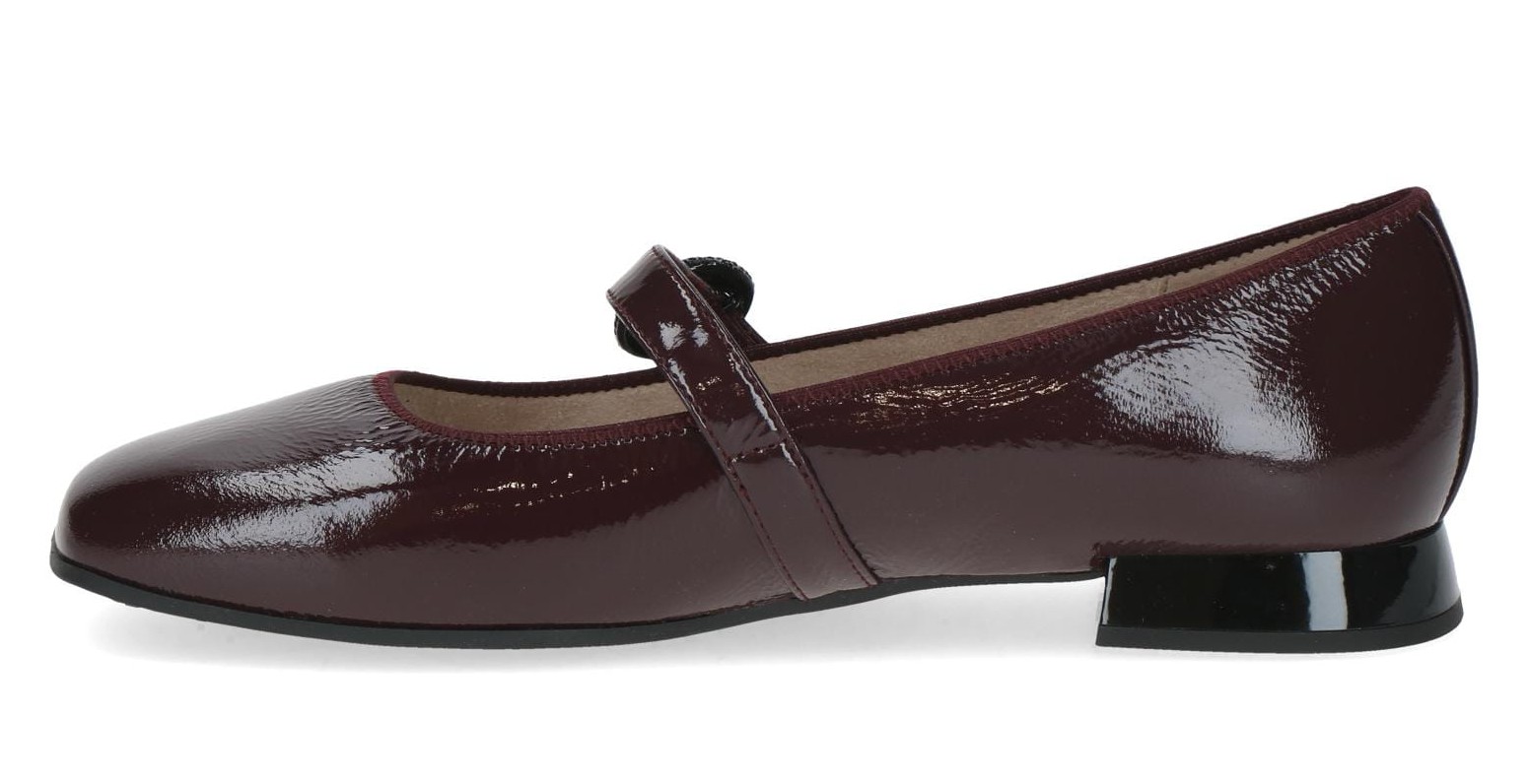 • Stylowe baleriny Mary Jane wykonane ze skóry lakierowanej w bordowym kolorze.
