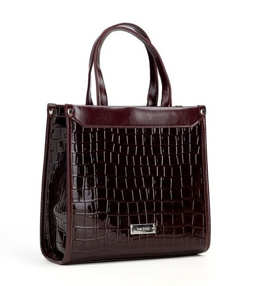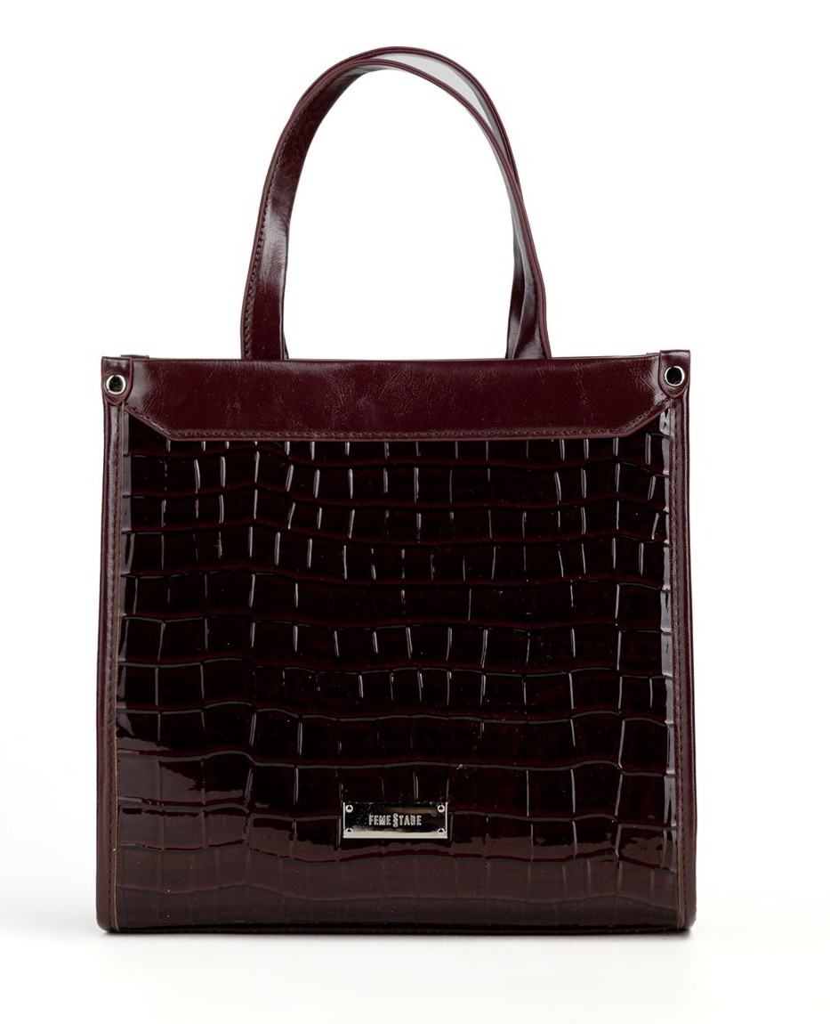 Nieduża torebka damska w fasonie kuferka marki FemeStage to idealne połączenie elegancji i praktyczności. Wykonana z ekologicznej lakierowanej, tłoczonej skóry w głębokim bordowym kolorze. Model wyposażony w krótkie uchwyty, dzięki którym można ją wygodnie nosić w dłoni lub na przedramieniu. Dla większej swobody użytkowania model wyposażono również w długi, odpinany pasek, umożliwiający noszenie torebki na ramieniu lub na ukos – idealne rozwiązanie dla kobiet ceniących komfort i funkcjonalność. Wnętrze torebki wyłożone jasną logowaną podszewką, skrywa dwie otwarte kieszonki i jedną zamykaną na suwak.