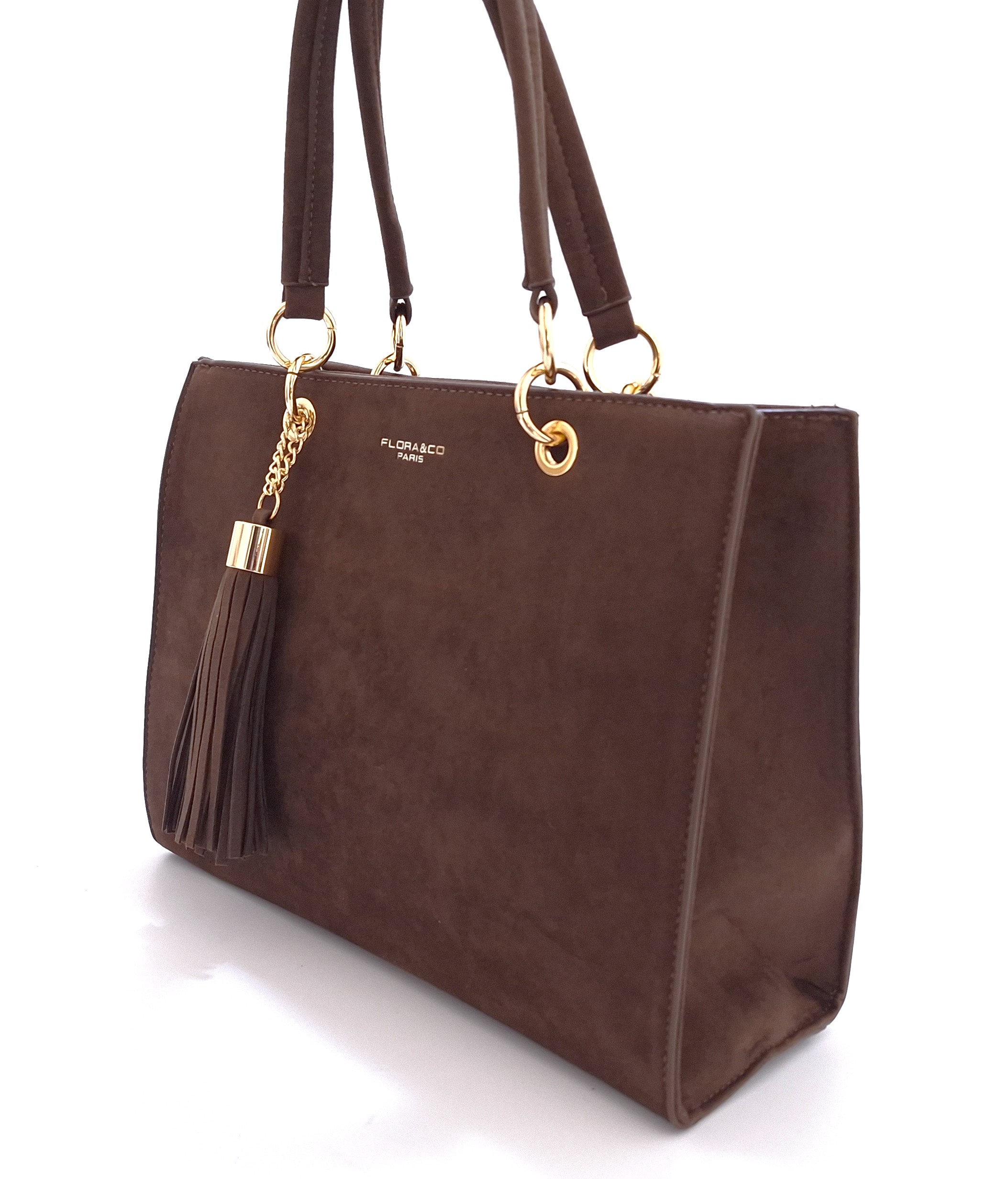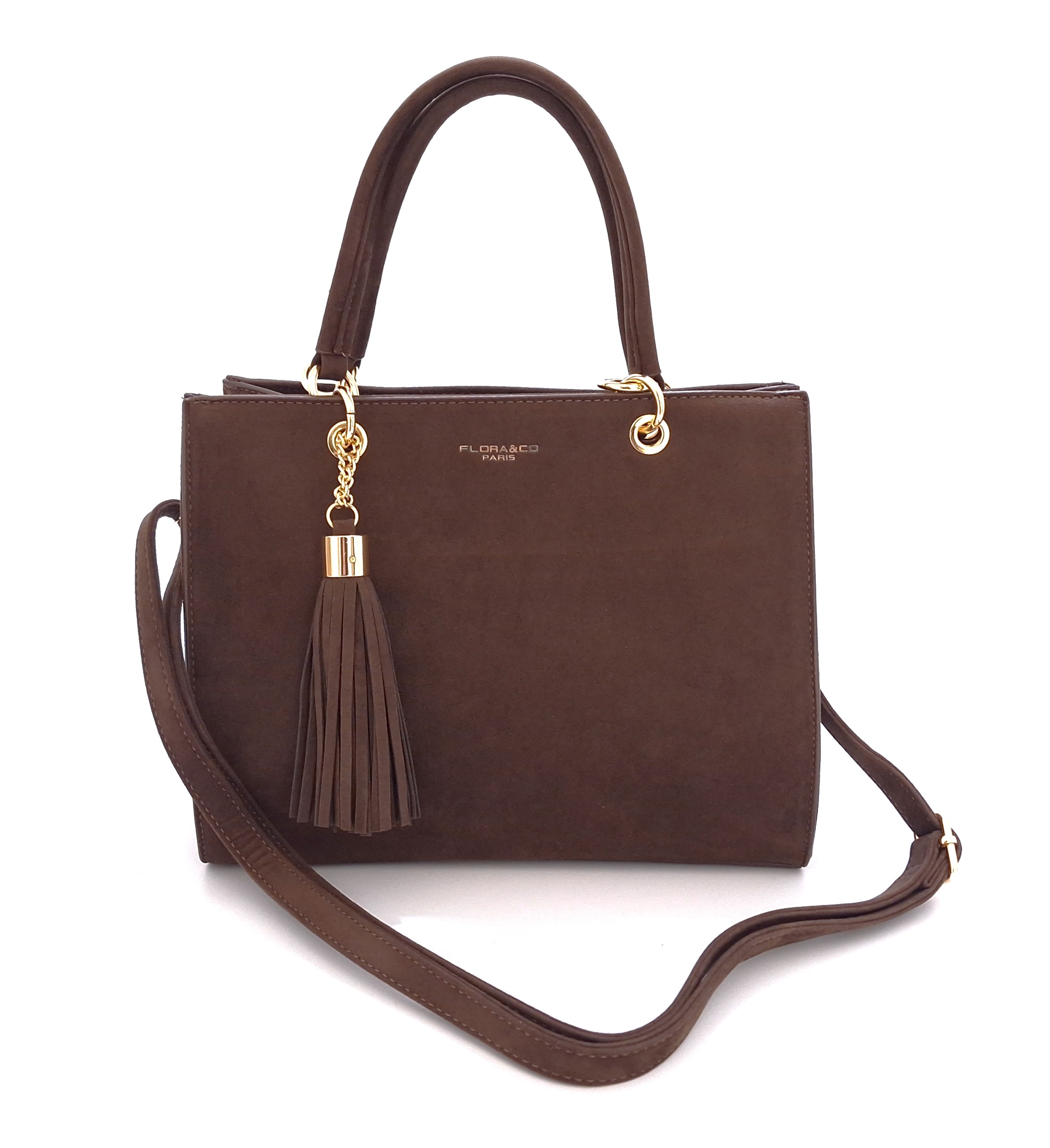 Jednokomorowa torebka damska marki Flora&Co wykonana z ekologicznej skóry zamszowej w brązowym kolorze. Model posiada dwa uchwyty oraz odpinany i regulowany pasek, dzięki czemu można nosić ją w dłoni, na ramieniu lub przez ramię. Uwagę zwraca ozdobny breloczek w postaci chwosta. Spód torebki chronią metalowe nóżki. Torebkę można nosić zarówno ze stylizacjami casualowymi, jak i eleganckimi.