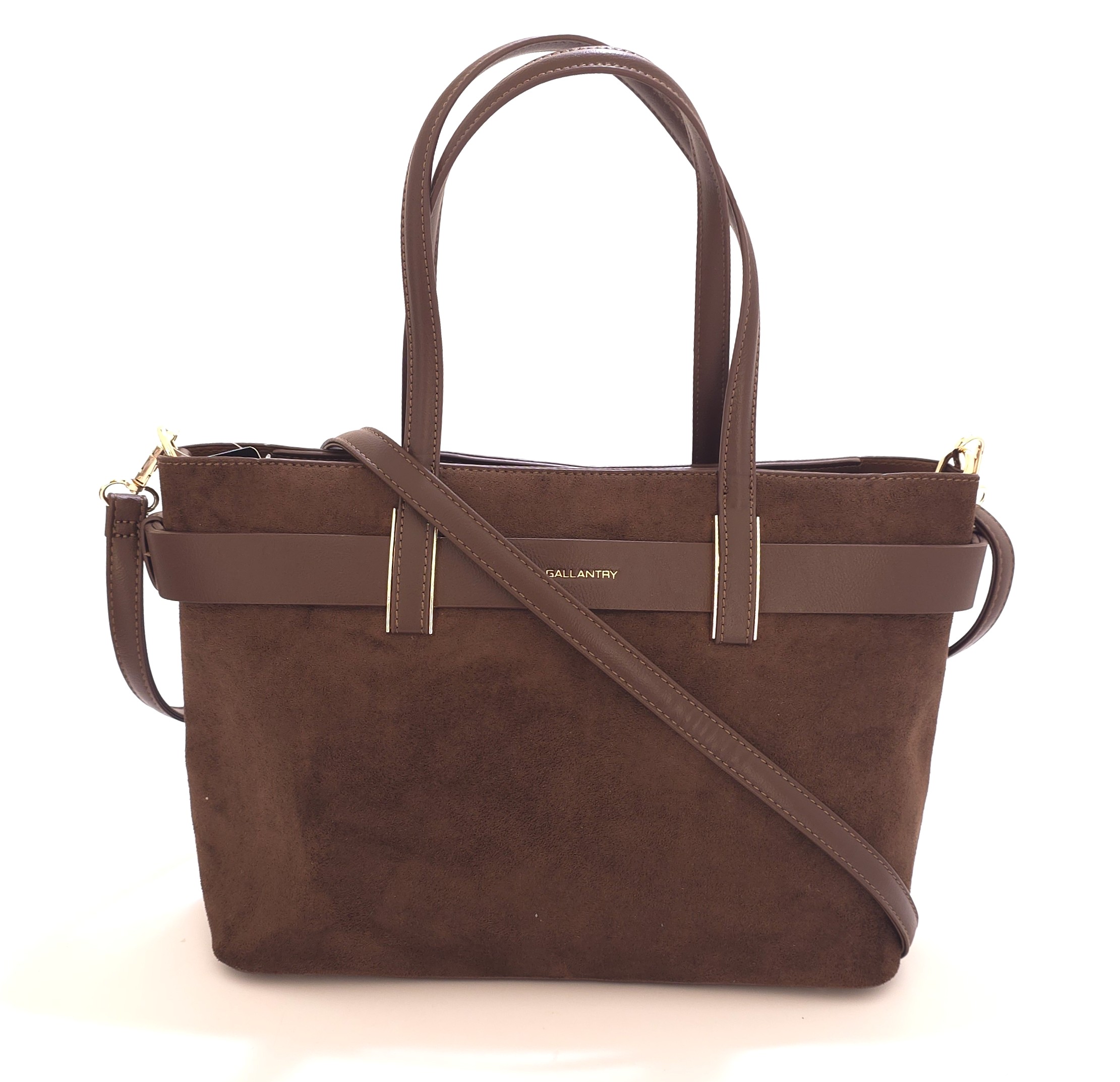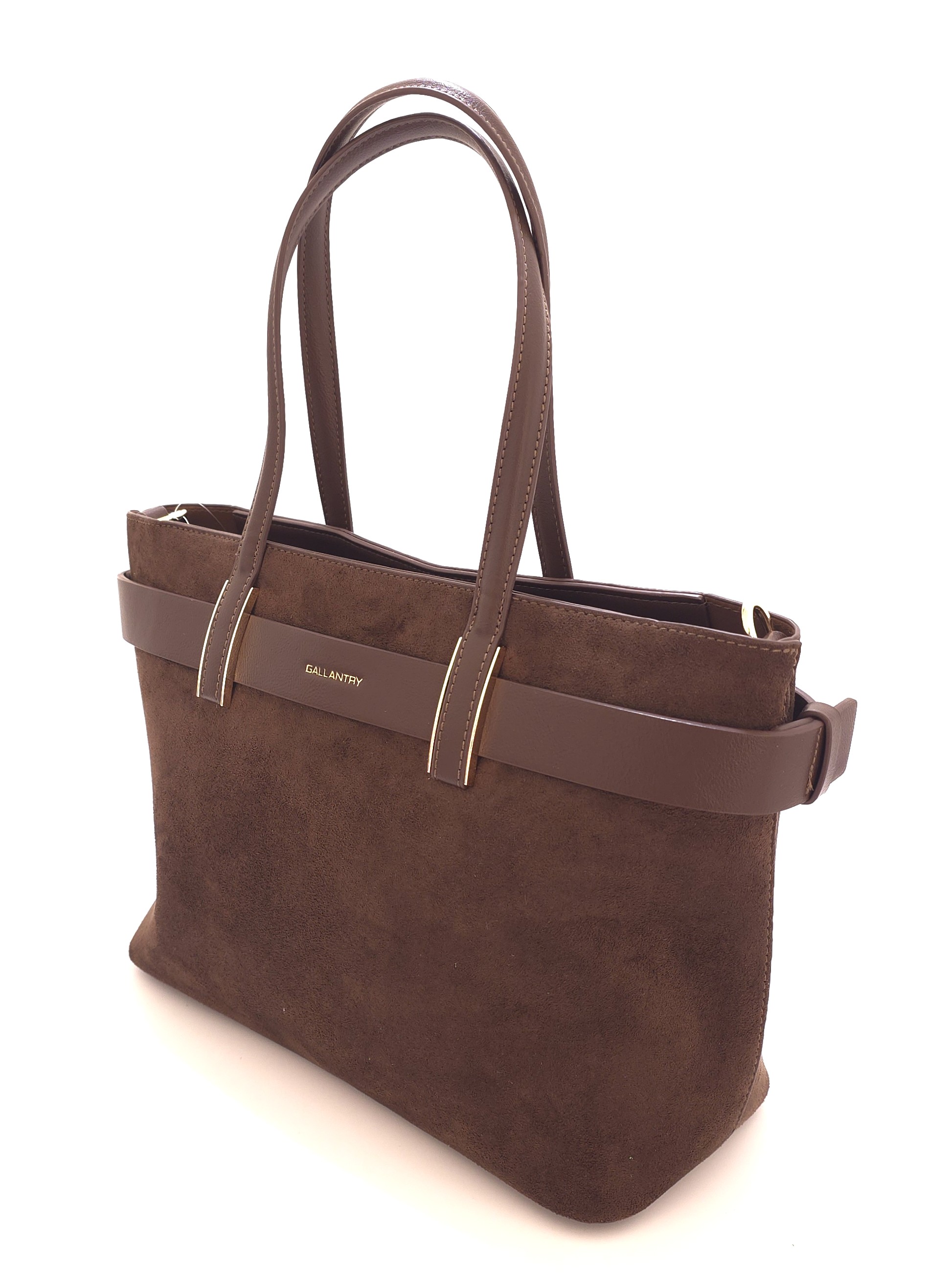 Brązowa torebka damska typu kuferek marki Gallantry wykonana z ekologicznej skóry zamszowej. Torebka jest niezwykle wszechstronna, dla miłośniczek elegancji i minimalizmu. Model posiada dwa uchwyty oraz dopinany pasek, który pozwala na noszenie jej na różne sposoby – w dłoni, na ramieniu lub na ukos. Spód torebki chronią metalowe nóżki. Torebka świetnie sprawdzi się zarówno na co dzień jak i na inne uroczystości wymagające formalnego stroju.