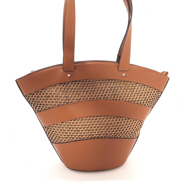 Brązowa damska torebka w typie koszyka marki Pepe Moll. Wykonana z połączenia materiału syntetycznego i skóry ekologicznej. Pojemna komora została uzupełniona dodatkową kieszonką zamykaną na zamek.Model zdobi plecionka nadając torebce charakteru. Wysokie uchwyty umożliwiają wygodne noszenie torby na ramieniu.