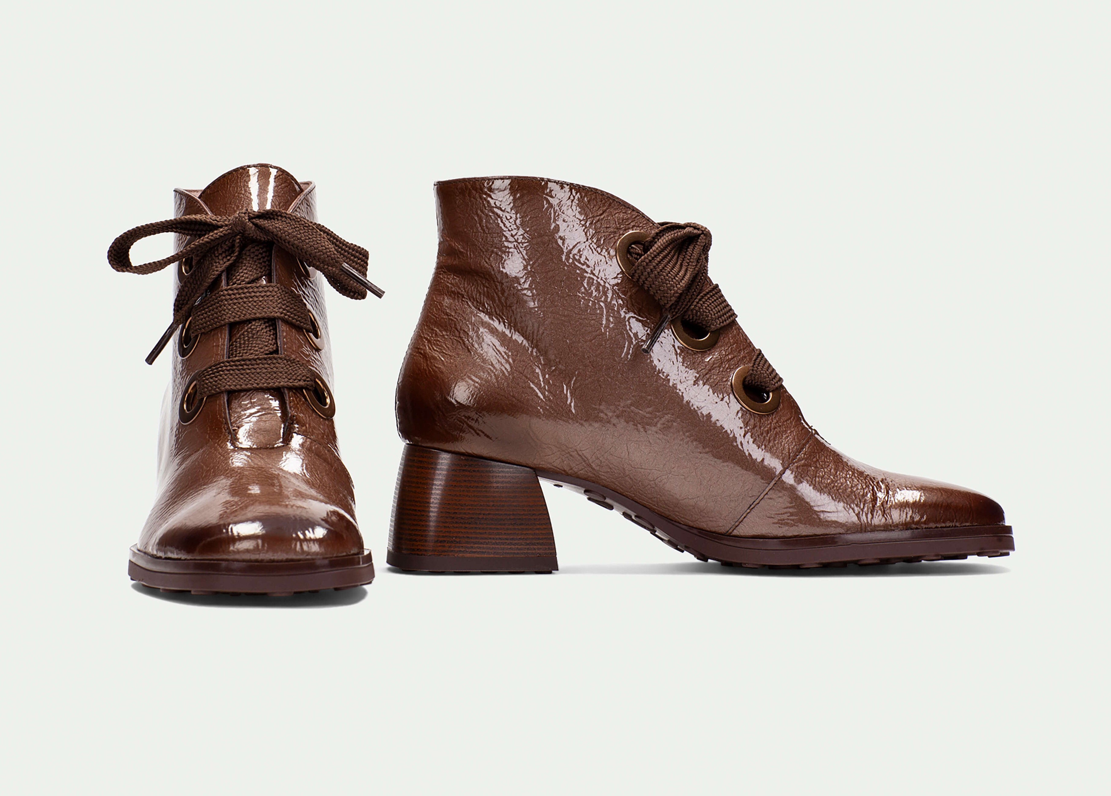 Styl i wygoda w jednym modelu! Eleganckie botki damskie na obcasie Hispanitas to doskonały wybór na jesień i zimę dla kobiet, które cenią sobie klasyczny design i wygodę. Wykonane z lakierowanej skóry w brązowym kolorze. Lakierowane wykończenie sprawia, że botki idealnie nadają się na różne okazje, od codziennych wyjść po bardziej formalne spotkania. Model ten wyróżnia się sznurowaniem, które nie tylko zapewnia idealne dopasowanie do stopy, ale też stanowi stylowy akcent. Złote oczka dodają subtelnej elegancji i nowoczesnego charakteru. Stabilny niewysoki obcas gwarantuje komfort nawet przy dłuższym noszeniu.