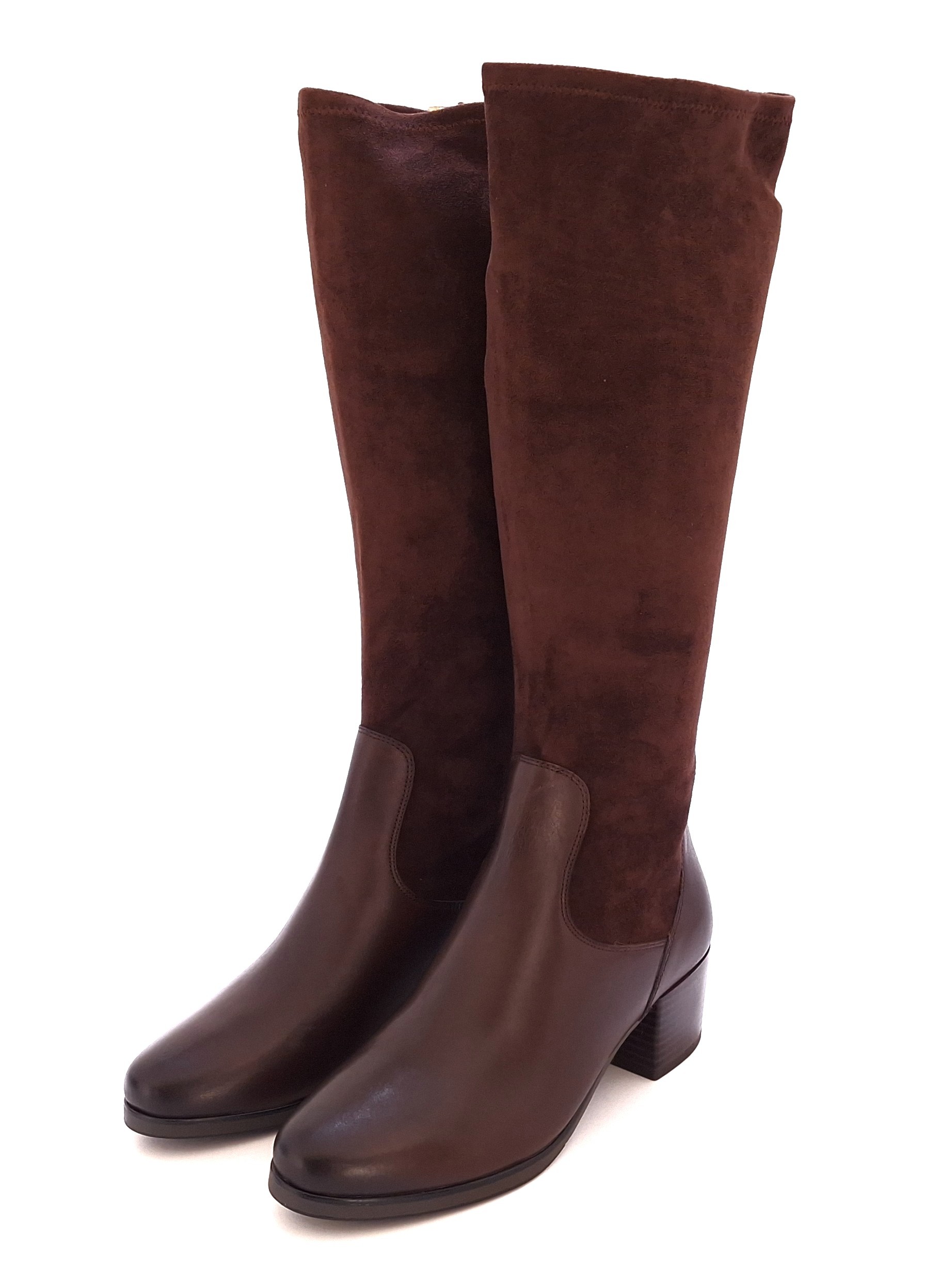 - Brązowe, wsuwane damskie kozaki na stabilnym słupku, wykonane z połączenia skóry naturalnej z materiałem stretchowym.