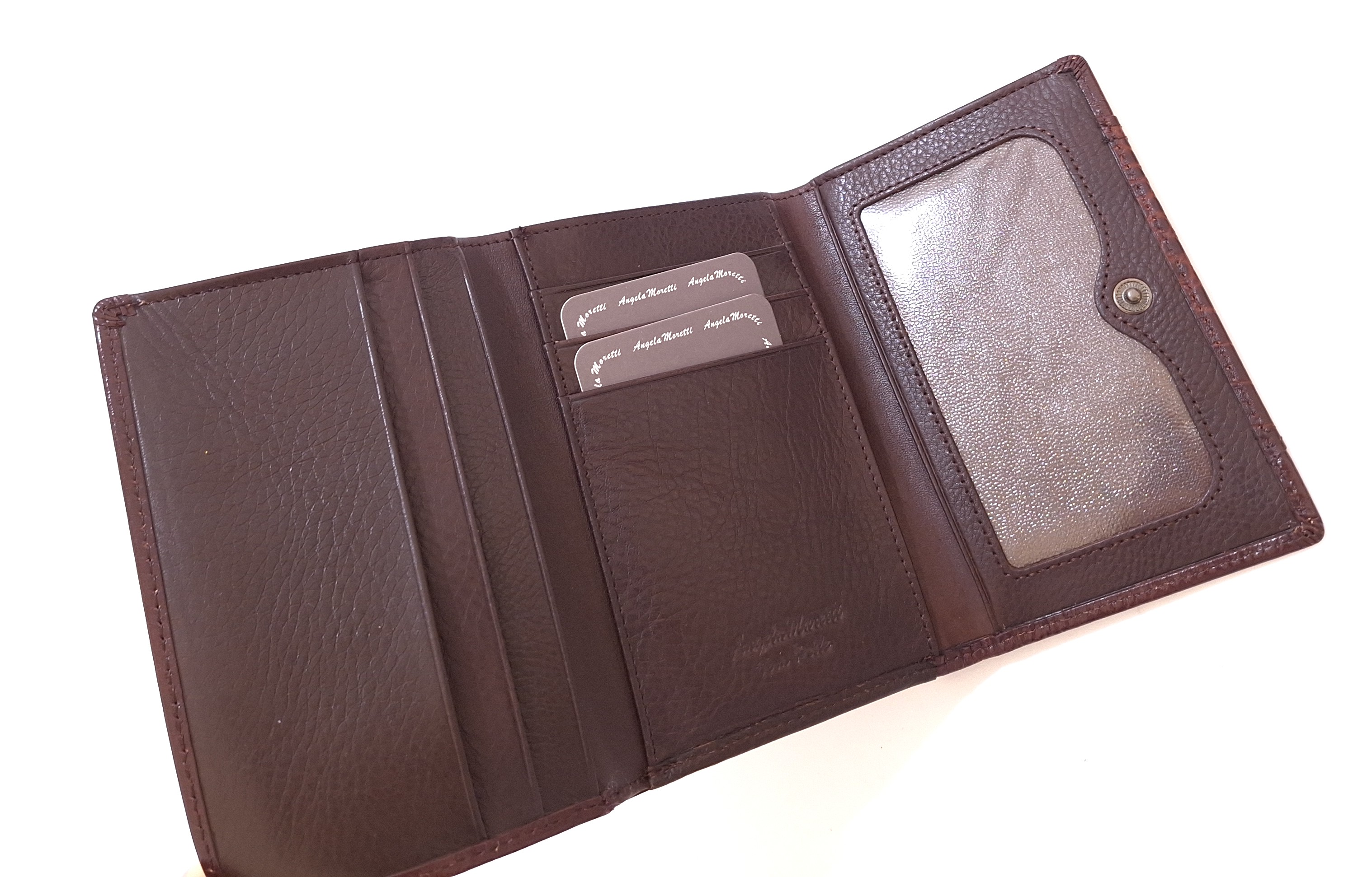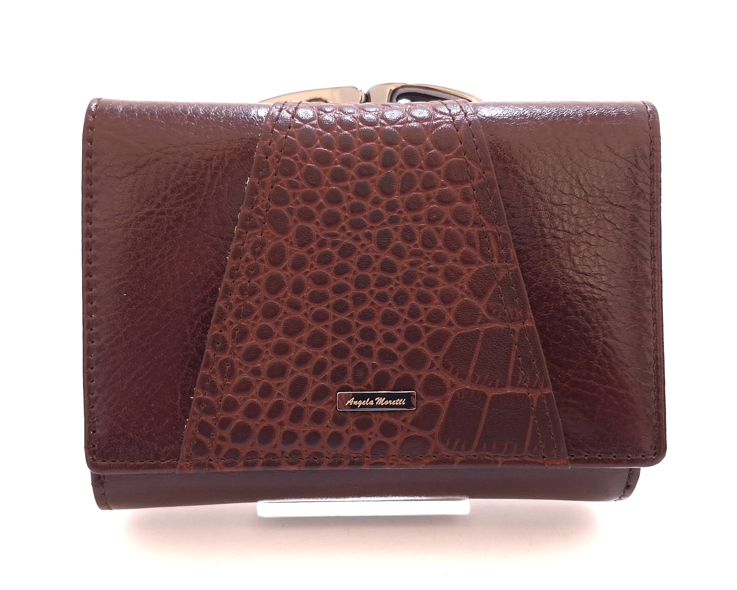 Brązowy portfel damski marki Angela Moretti z naturalnej skóry to funkcjonalny dodatek. Przód ozdobiony jest tłoczonym wzorem imitującym skórę krokodyla. Portfel zamykany klapką z napem na której umieszczona jest blaszka z nazwą marki. Pojemne wnętrze pomieści wszystkie najpotrzebniejsze dokumenty, banknoty, karty płatnicze oraz bilon oferując wygodę użytkowania.
