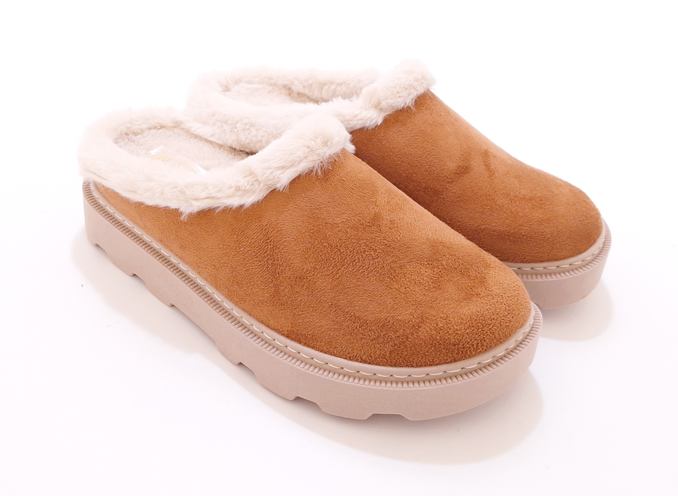- Wsuwane, ocieplane kapcie damskie w brązowym kolorze. Wyprodukowane w Hiszpanii.