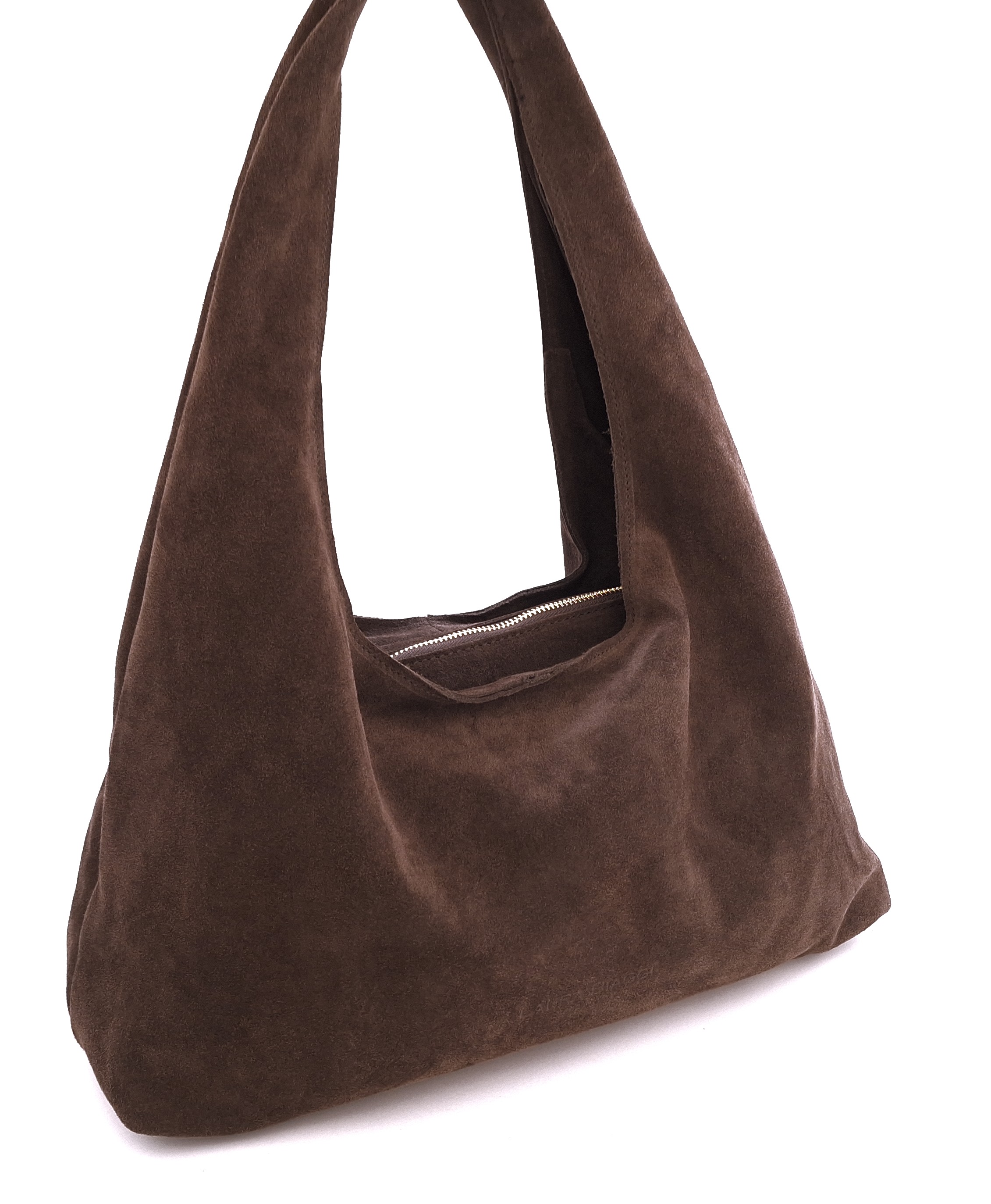 - Torebka damska na ramię o fasonie worka wykonana z zamszowej skóry naturalnej w ciemnobrązowym kolorze.