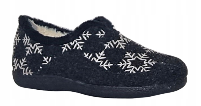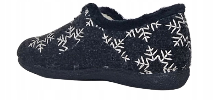 Kapcie damskie włoskiej marki Sanital Flex w kolorze czarnym. Cholewka wykonana z miękkiej tkaniny przypominającej naturalny filc została subtelnie ozdobiona wzorem w śnieżynki. Wnętrze oraz wkładka pokryte miękkim futerkiem syntetycznym zapewnia Twoim stopom niezwykłe ciepło i miękkość każdego dnia. Podeszwa TR bamboszy jest lekka, elastyczna i trwała oraz posiada właściwości antypoślizgowe, co gwarantuje pewność kroków niezależnie od podłoża.
