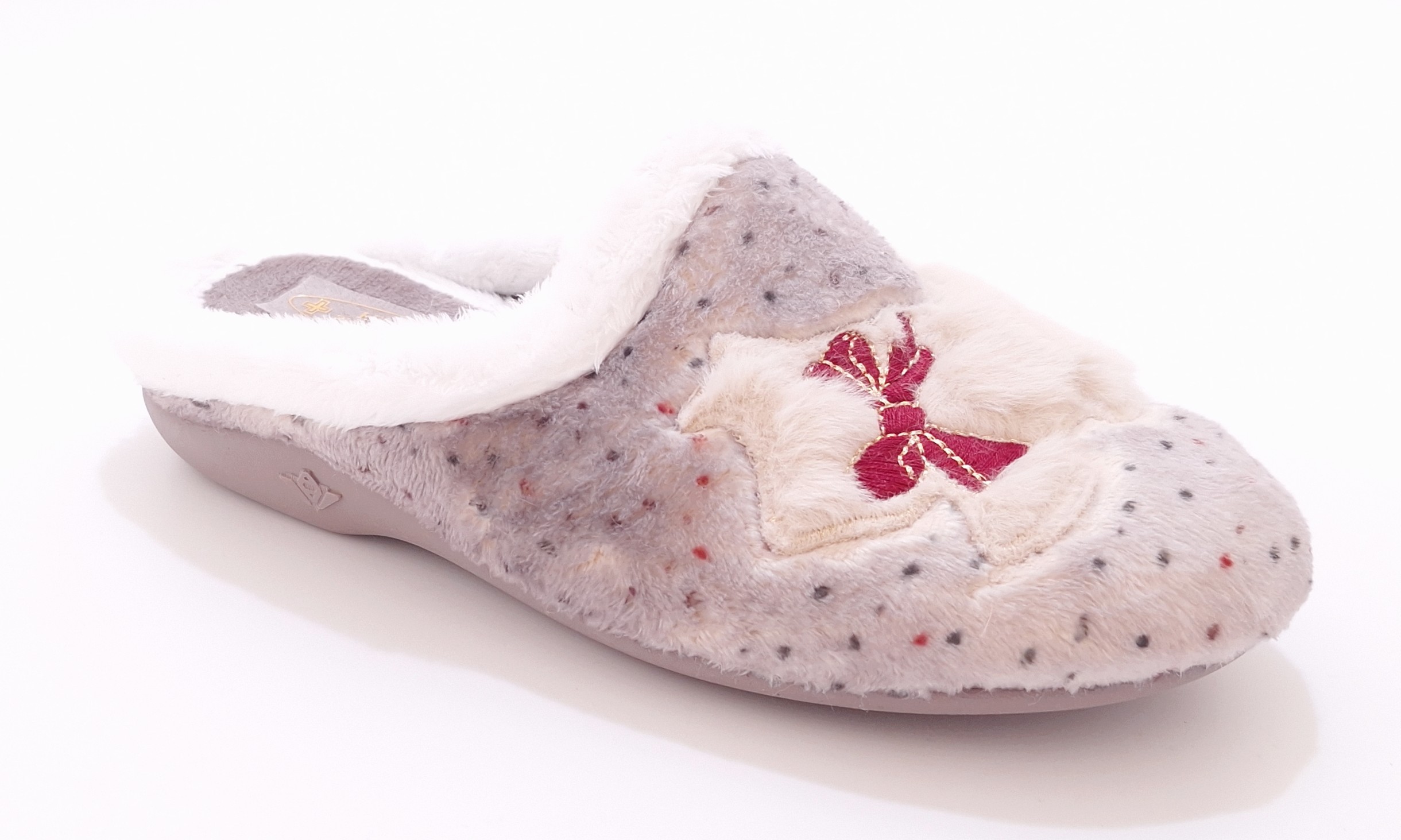 • Damskie kapcie wykonane z miękkiej tkaniny szewskiej, posiadają nadruk w postaci beżowego pieska . Wyprodukowane w Hiszpanii.