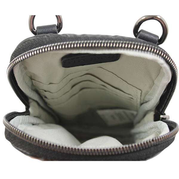 - Stylowa, a zarazem praktyczna torebka-etui na telefon, wykonana materiału syntetycznego. Zawieszona na regulowanym pasku. Wewnątrz 3 kieszonki na karty płatnicze. 100 % vegańska.