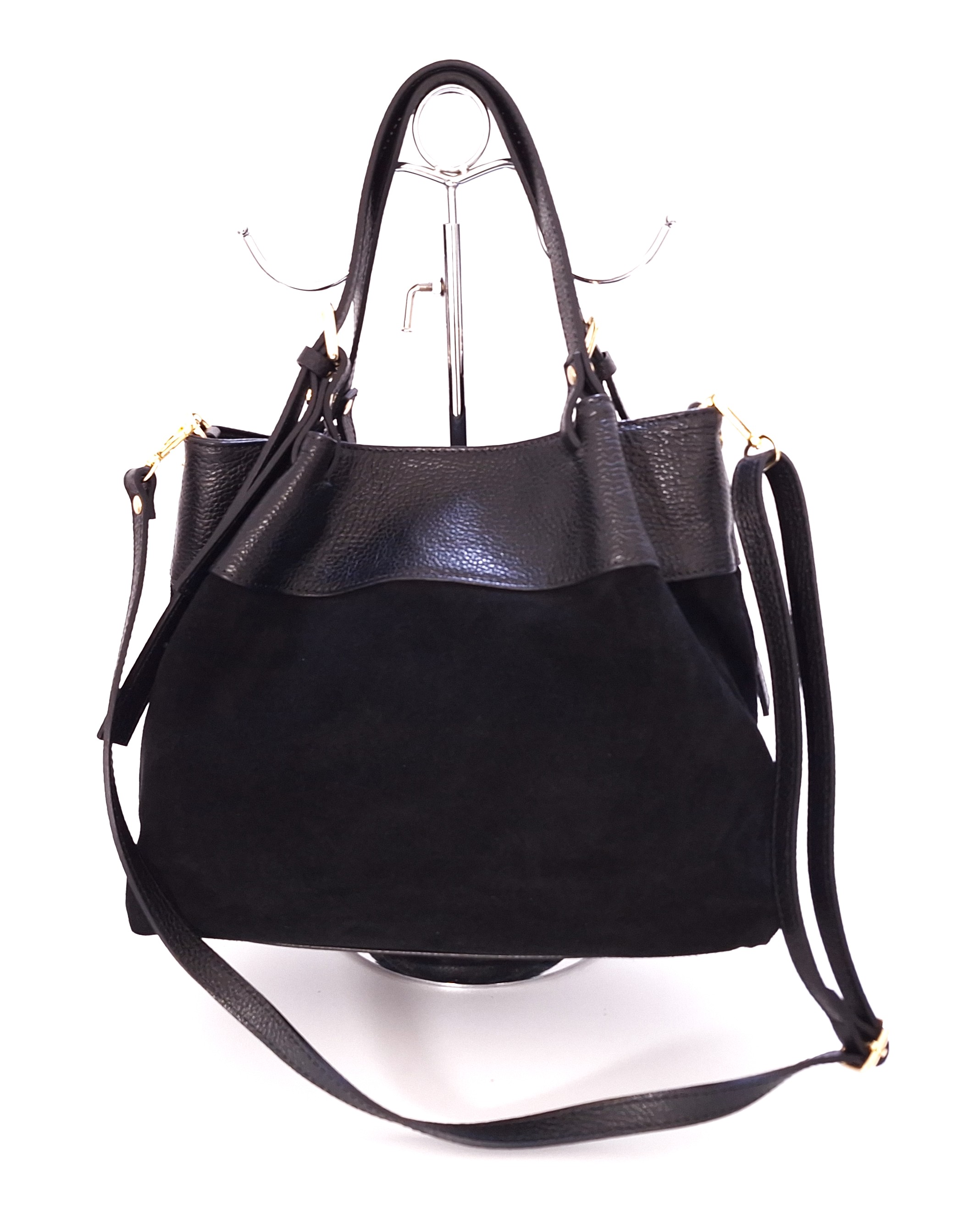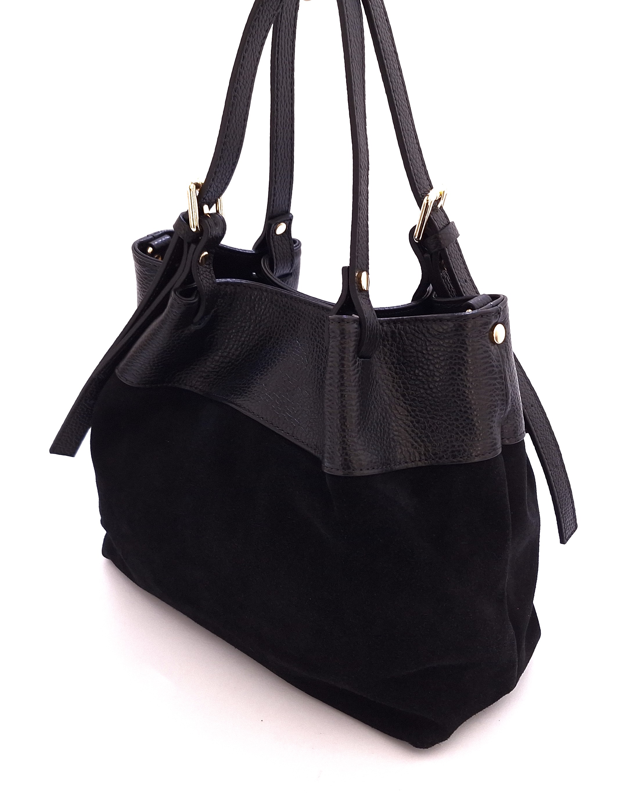 - Torebka uszyta z połączenia naturalnej skóry licowej i zamszowej w czarnym kolorze,