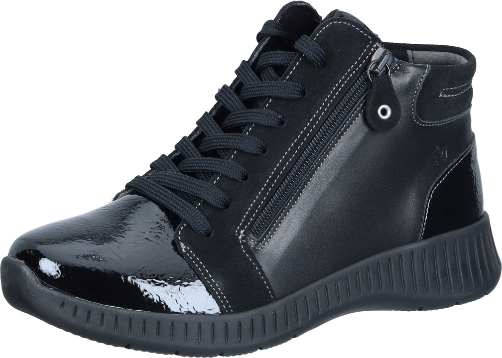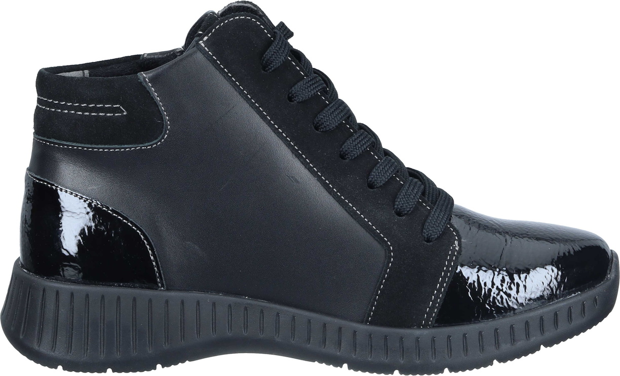 Botki damskie w bardzo szerokiej tęgości K portugalskiej marki Suave to doskonały wybór dla kobiet z wymagającymi stopami. Wykonane z naturalnej skóry w kolorze czarnym. Model wyposażony jest w boczny zamek oraz sznurowanie, co ułatwia zakładanie i zdejmowanie obuwia, a także umożliwia idealne dopasowanie do indywidualnego kształtu stopy. Wyjmowana, miękka wkładka zapewnia komfort użytkowania i pozwala na łatwą wymianę na własną wkładkę ortopedyczną. Wkładka posiada spodnią warstwę z elastycznej pianki oraz górną część wykonaną z wyjątkowo miękkiej tkaniny szewskiej. Elastyczna podeszwa PU charakteryzuje się doskonałą przyczepnością do podłoża oraz wysoką odpornością na ścieranie. Podwyższona tęgość K sprawia, że buty są idealne dla osób z szerszą i problematyczną stopą, gwarantując odpowiednią przestrzeń i wygodę podczas chodzenia