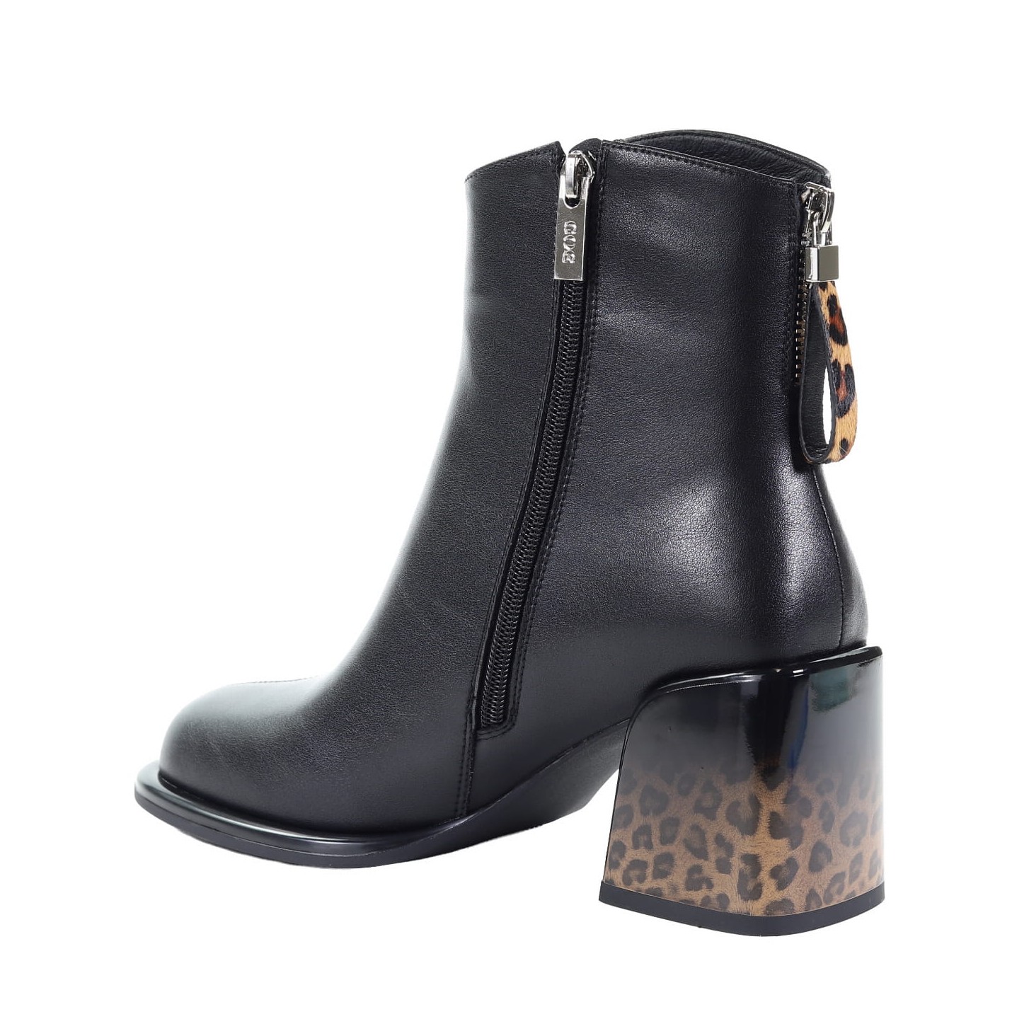 Klasyczne, czarne botki damskie marki Goe wykonane z gładkiej skóry licowej to elegancki model, który doskonale sprawdzi się na chłodniejsze dni. Cholewka zapinana na suwak ułatwia zakładanie i zapewnia idealne dopasowanie do nogi. Botki zostały osadzone na stabilnym, szerokim obcasie zdobionym panterkowym wzorem, który przełamuje klasyczną czerń i nadaje całości wyjątkowego charakteru. Lekko ocieplone wnętrze sprawia, że model idealnie sprawdzi się w sezonie jesień–zima.
