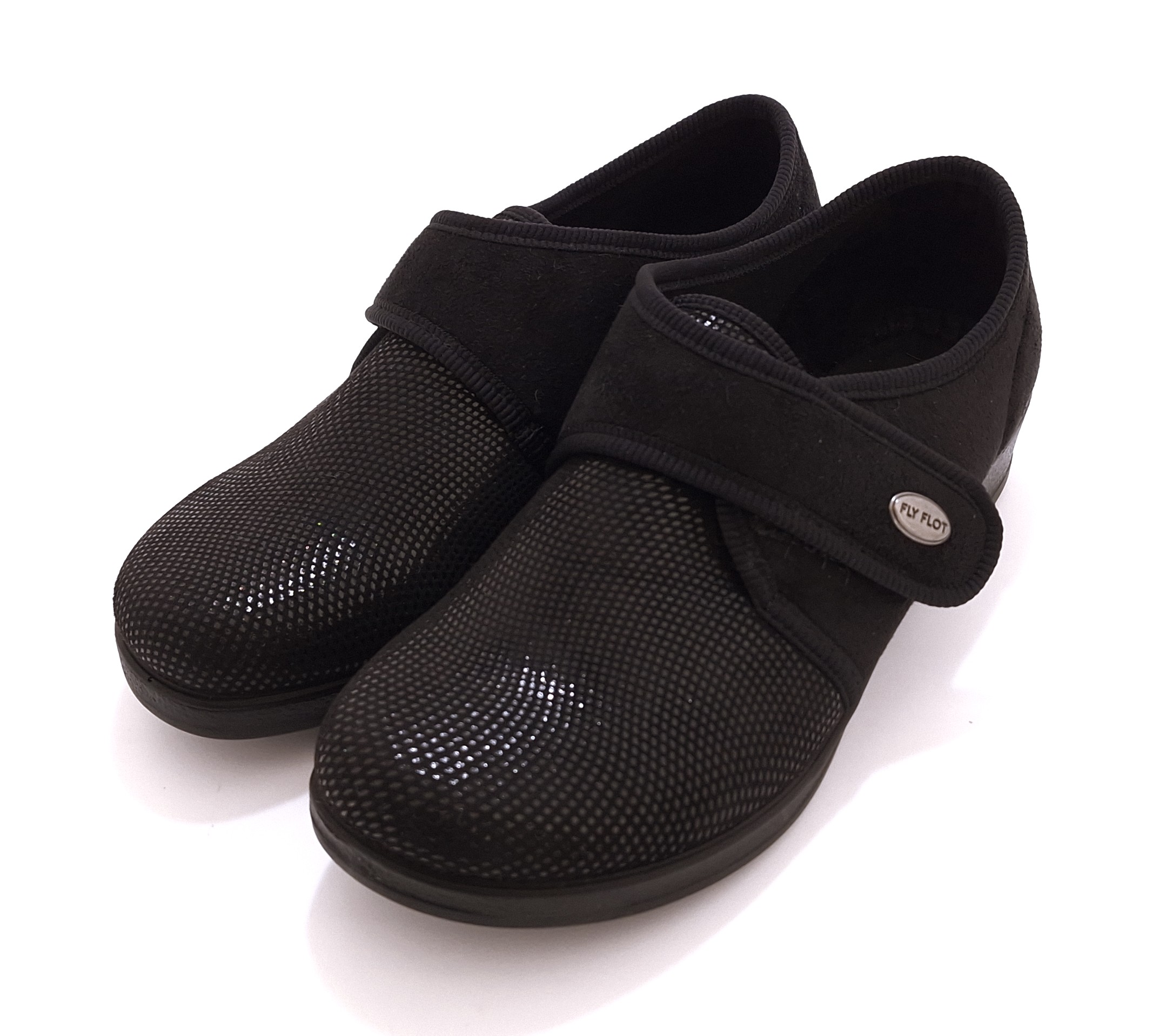 Komfortowe półbuty damskie zapinane na rzep włoskiej marki Fly Flot to obuwie dla osób z wrażliwymi stopami, ceniących komfort i wygodę. Wykonane z miękkiej, oddychającej tkaniny w kolorze czarnym. Z przodu znajduje się elastyczna wstawka, która delikatnie dopasowuje się do kształtu stopy, zapewniając maksymalny komfort nawet w przypadku miejsc szczególnie narażonych na otarcia czy ucisk. Lekka, elastyczna, antypoślizgowa podeszwa Piumatech Soft Flexible gwarantuje stabilność i amortyzacje podczas chodzenia. Podeszwa ta posiada wysoką odporność na ścieranie i dobrą przyczepnosć do podłoża. Zapięcie na rzep umożliwia szybkie zakładanie i dopasowanie obuwia do indywidualnych potrzeb stopy.