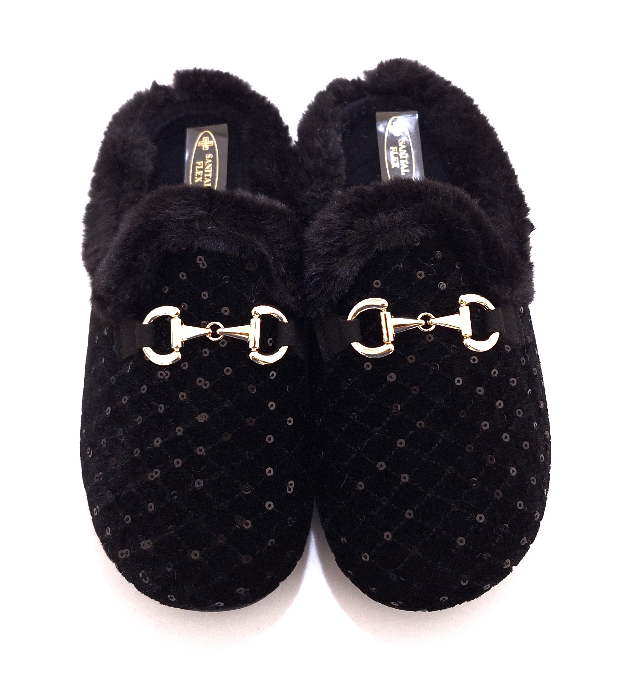 Czarne kapcie damskie włoskiej marki Sanital Flexto połączenie stylu i wyjątkowego komfortu. Zdobione subtelnymi, błyszczącymi cekinami oraz złotą ozdobą, zyskują niepowtarzalny charakter i elegancki wygląd. Miękkie futerko na cholewce emanuje ciepłem i zachęca do relaksu, tworząc przytulny efekt już przy pierwszym założeniu.