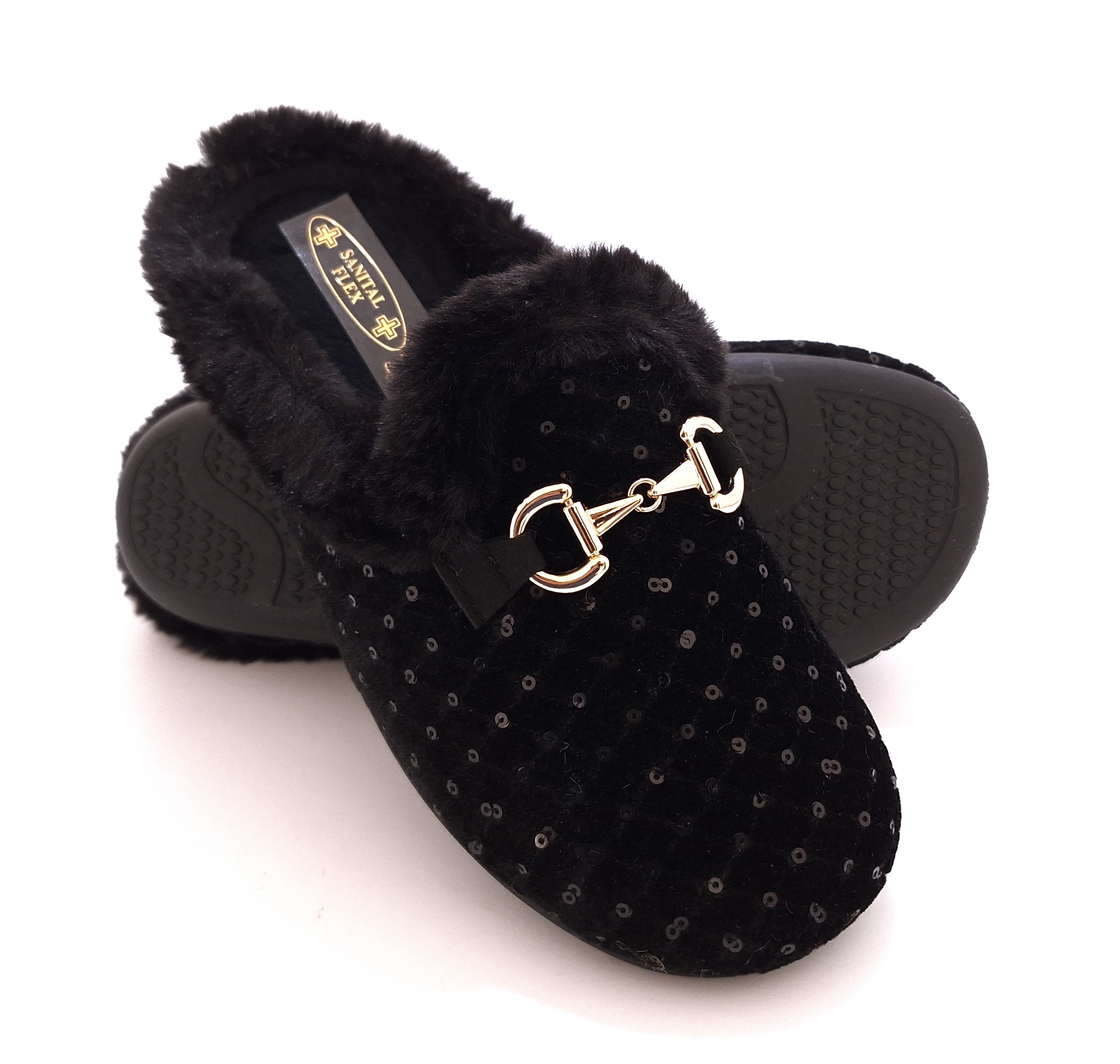 Czarne kapcie damskie włoskiej marki Sanital Flexto połączenie stylu i wyjątkowego komfortu. Zdobione subtelnymi, błyszczącymi cekinami oraz złotą ozdobą, zyskują niepowtarzalny charakter i elegancki wygląd. Miękkie futerko na cholewce emanuje ciepłem i zachęca do relaksu, tworząc przytulny efekt już przy pierwszym założeniu.