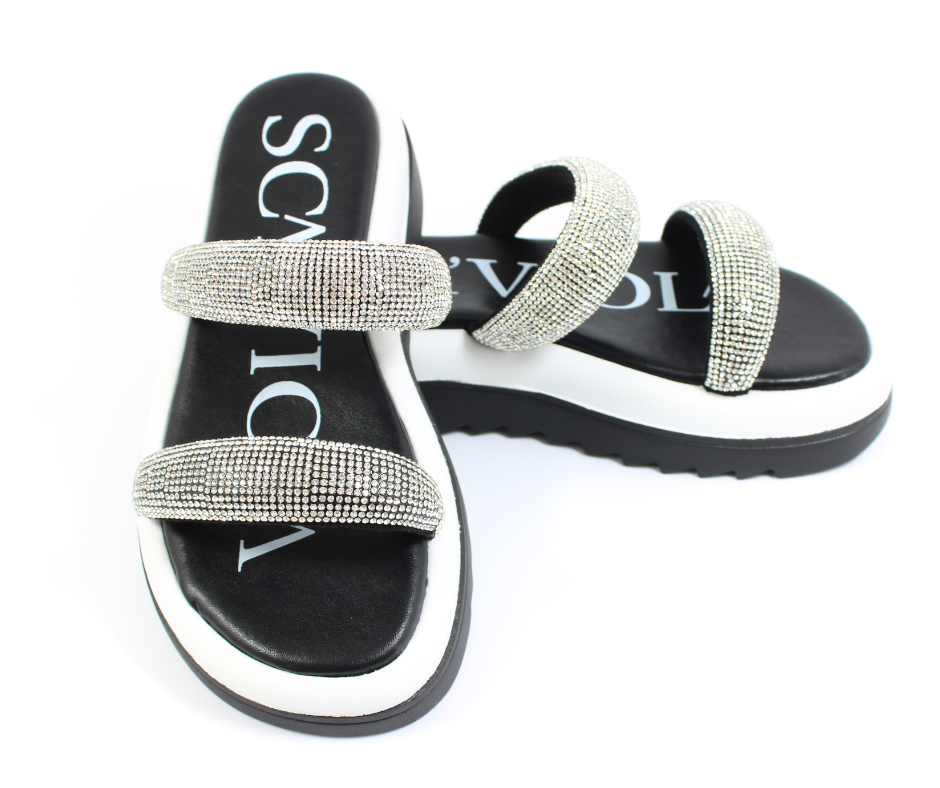 Szukasz idealnych klapek na letnie dni? Mamy dla Ciebie propozycję, która z pewnością Cię zachwyci! Postaw na niezwykle efektowne klapki na platformie marki Scaviola, które łączą w sobie wygodę, styl i najmodniejszy design. Wykonane z wysokiej jakości materiałów sandały zapewniają komfort noszenia przez cały dzień. Przednia część buta posiada dwa paski wykonane z materiału ozdobione mieniącymi się cyrkoniami, które nadają im blasku i charakteru. Wkładka wykonana z miękkiej skóry ekologicznej gwarantuje przyjemność z użytkowania nawet podczas długich spacerów. Klapki zostały oparte na masywnej podeszwie o wysokości 3,5 cm, która w tylnej części mierzy 4,5 cm.