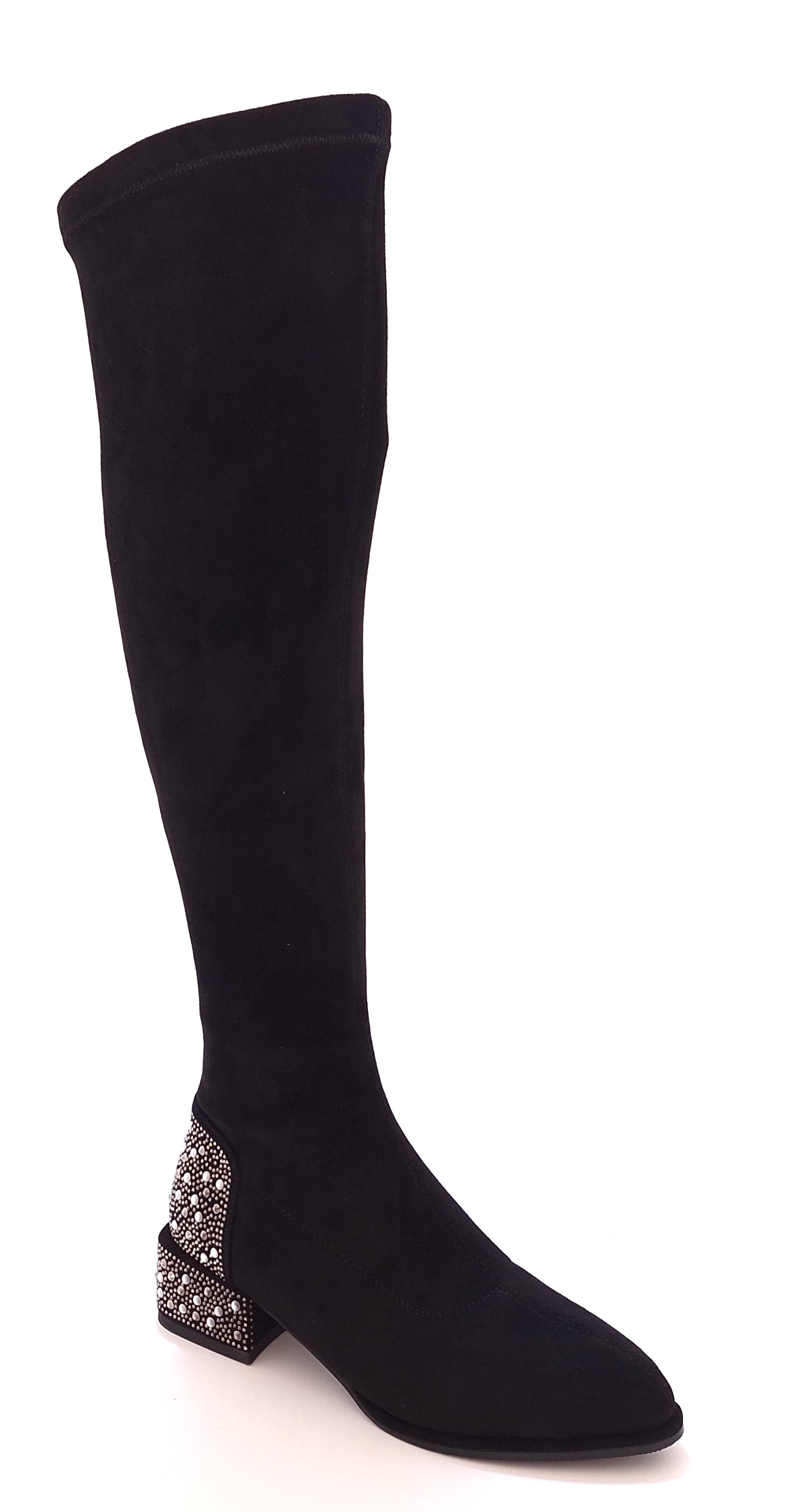 • Stylowe kozaki damskie za kolano w czarnym kolorze. Wysoka cholewka, ozdobne cyrkonie, stabilny obcas i wygodny zamek – idealne na chłodniejsze dni.