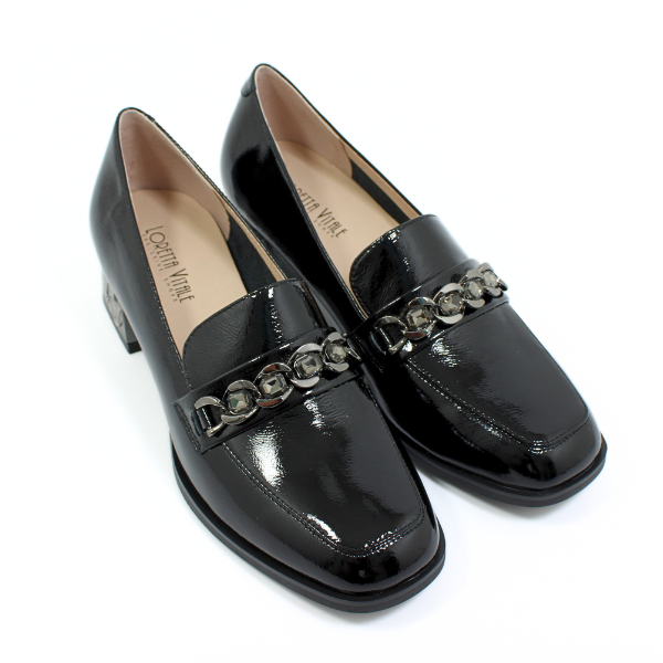 Czarne mokasyny na szerokim obcasie marki Loretta Vitale to model łączący elegancje, komfort i wysoką jakość. Wykonane z lakierowanej skóry licowej, te wsuwane półbuty damskie wyróżniają się na tle innych dzięki niepowtarzalnemu obcasowi, wysadzanemu mieniącymi się diamentami. Przód buta zdobi ozdobny łańcuszek, również pokryty lśniącymi kamieniami, co subtelnie podkreśla ich wyjątkowy design.
