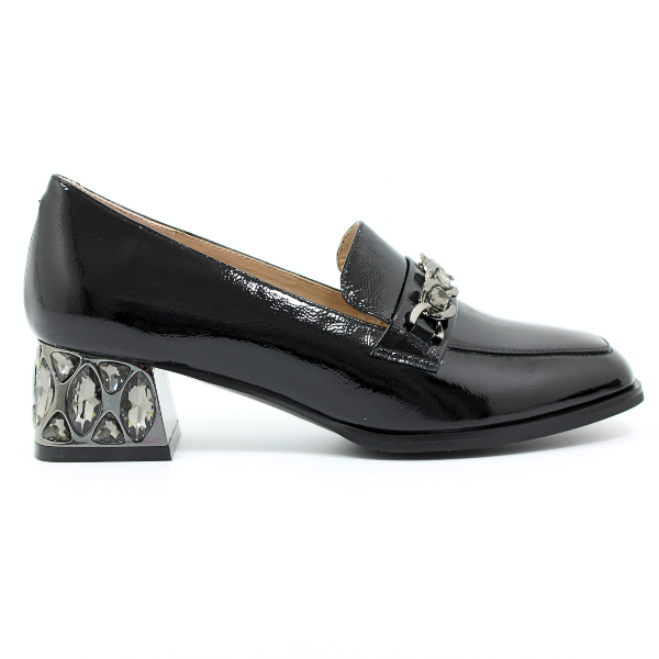 Czarne mokasyny na szerokim obcasie marki Loretta Vitale to model łączący elegancje, komfort i wysoką jakość. Wykonane z lakierowanej skóry licowej, te wsuwane półbuty damskie wyróżniają się na tle innych dzięki niepowtarzalnemu obcasowi, wysadzanemu mieniącymi się diamentami. Przód buta zdobi ozdobny łańcuszek, również pokryty lśniącymi kamieniami, co subtelnie podkreśla ich wyjątkowy design.