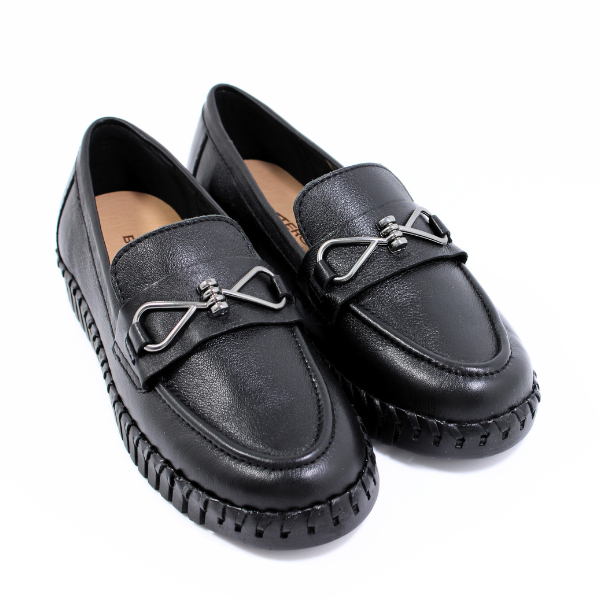 Czarne mokasyny damskie marki Bottero to obuwie łączące komfort i styl. Wykonane ze skóry naturalnej, zapewniają trwałość i komfort użytkowania. Z przodu umieszczona srebrna ozdoba dodająca szyku. Płaska, elastyczna podeszwa ozdobiona przeszyciami, gwarantuje komfort noszenia przez cały dzień. Ich klasyczny design pasuje do wielu stylizacji- od casualowych, codziennych outfitów po formalne. Półbuty idealnie komponują się zarówno z jeansami, jak i sukienkami.
