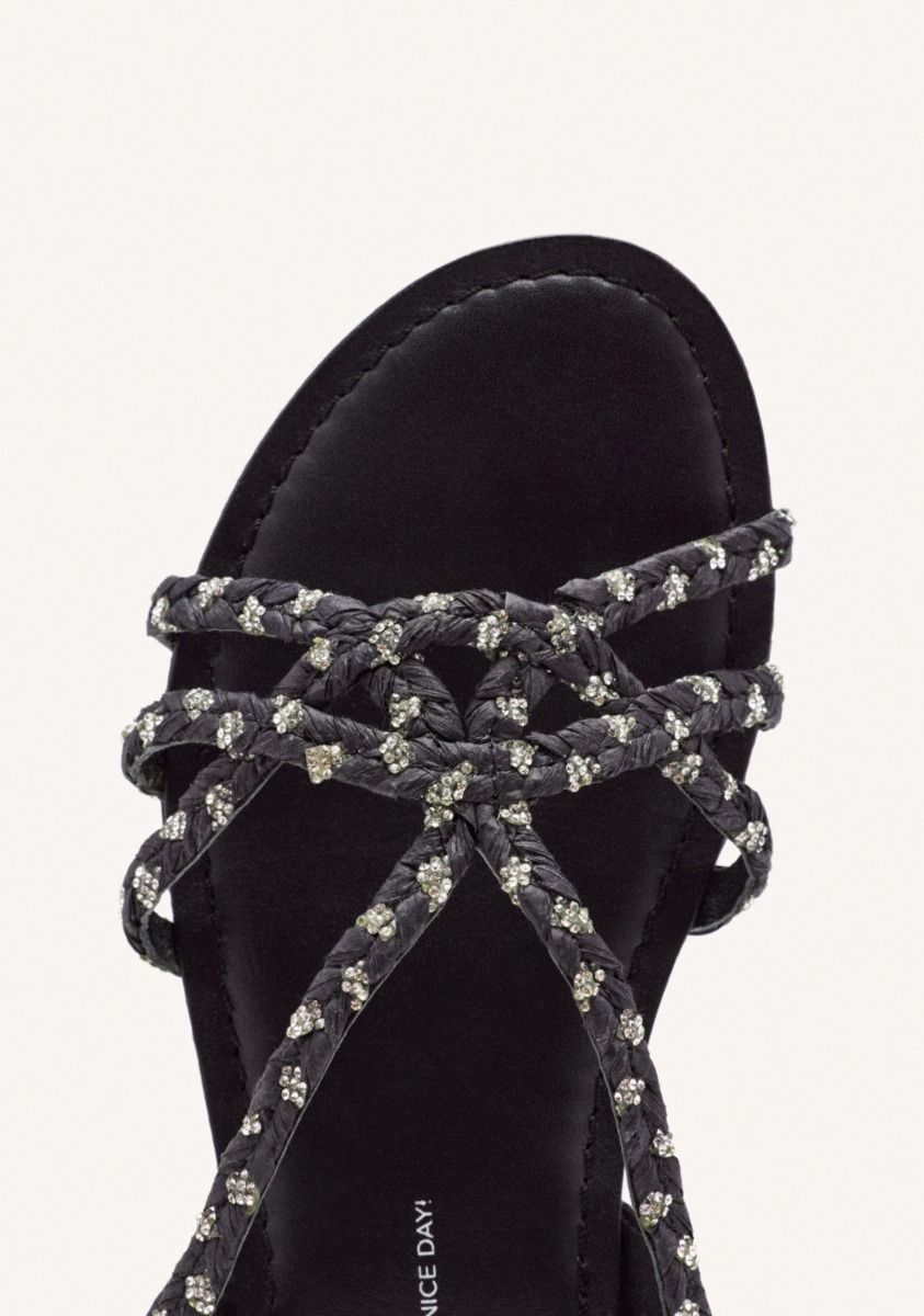- Czarne sandały Gioseppo z naturalnej skóry i rafii. Ozdobne plecione paski z błyszczącym akcentem i płaska podeszwa zapewniają wygodę i styl na lato.