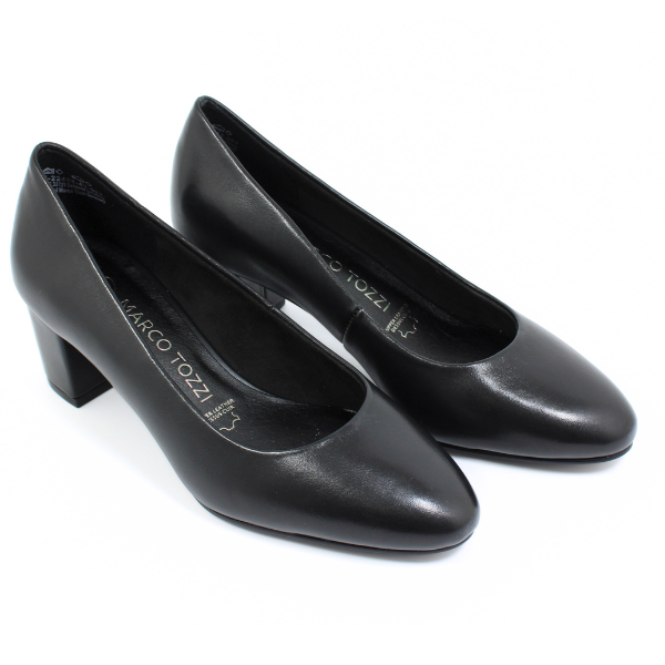 Skórzane czółenka damskie marki Marco Tozzi w kolorze czarnym to idealne połączenie elegancji, wygody i uniwersalnego stylu. Cholewka wykonana z wysokiej jakości naturalnej skóry licowej dopasowuje się do stopy i zapewnia doskonałą trwałość. Szeroki obcas w formie słupka gwarantuje stabilność i pewność stawianych kroków. Miękka wkładka z technologią Feel Me dopasowuje się indywidualnie do stopy zwiekaszjąc przy tym komfort użytkowania. Dzięki klasycznemu designowi, czółenka idealnie sprawdzą się zarówno w biurowych, jak i casualowych stylizacjach.