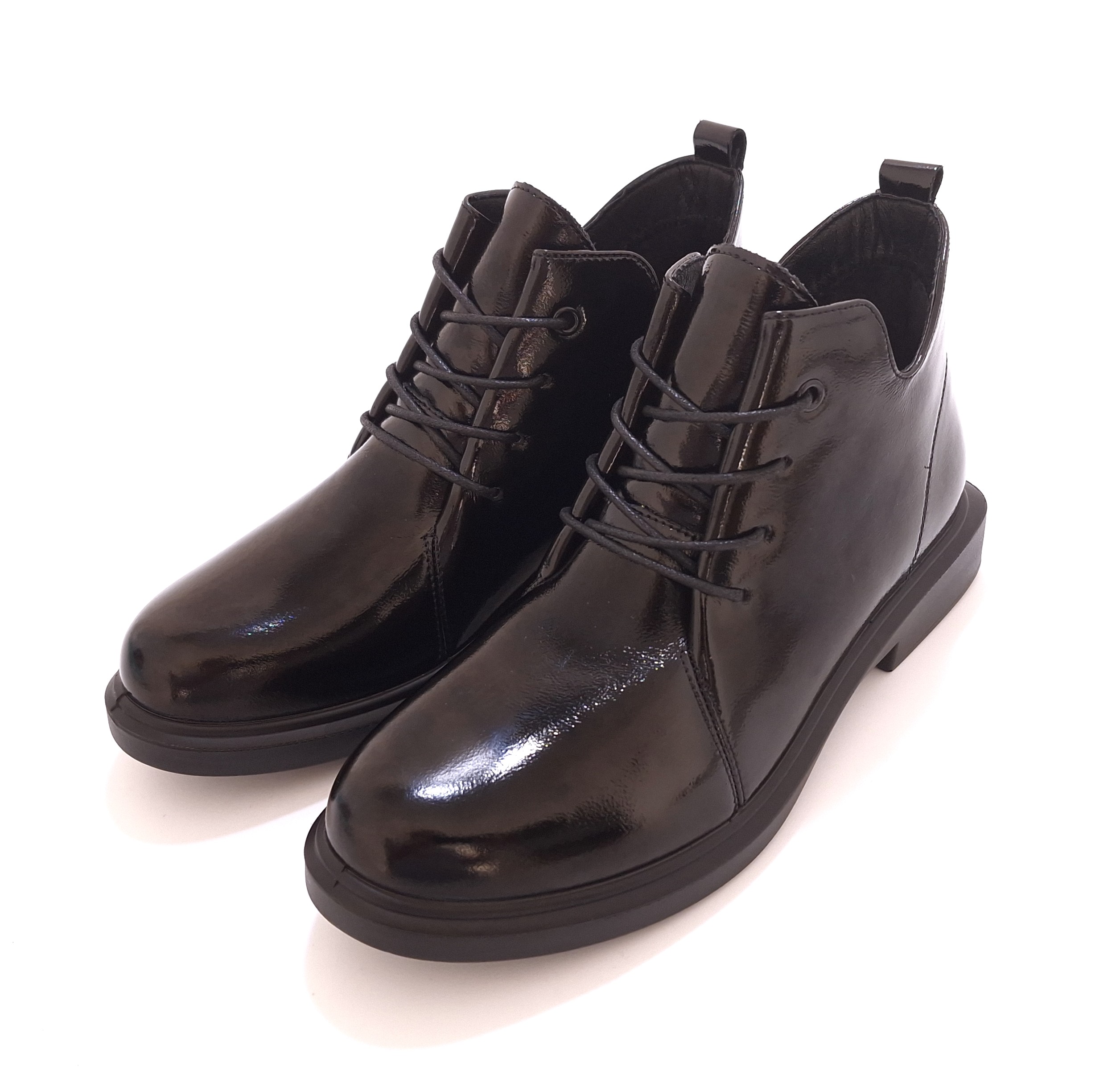 • Skórzane trzewiki damskie z lakierowanej skóry. Ocieplane, wygodne i eleganckie – idealne buty na jesień i zimę.