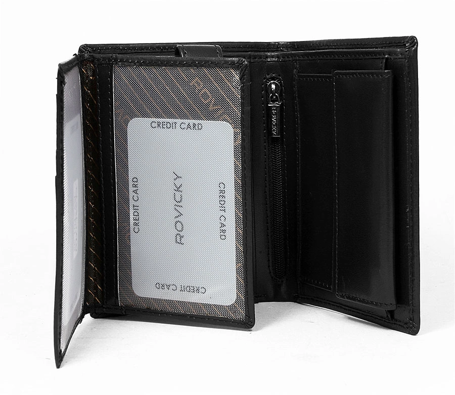 Skórzany portfel męski marki Rovicky wykonany z naturalnej skóry bydlęcej w czarnym kolorze. Portfel jest dużego rozmiaru bez zapięcia, jest składany na pół. Model o orientacji pionowej, na froncie znajduje się tłoczenie. Posiada wiele przegródek na banknoty, wizytówki, karty i dokumenty zamykane na zatrzask oraz dodatkową kieszeń na suwak będzie doskonała na przechowywanie cennych drobiazgów. Znajdziemy także praktyczną kieszonkę na bilon na zatrzask. Portfel posiada wbudowaną ochronę RFID, która zabezpiecza karty przed nieupoważnionym zeskanowaniem.