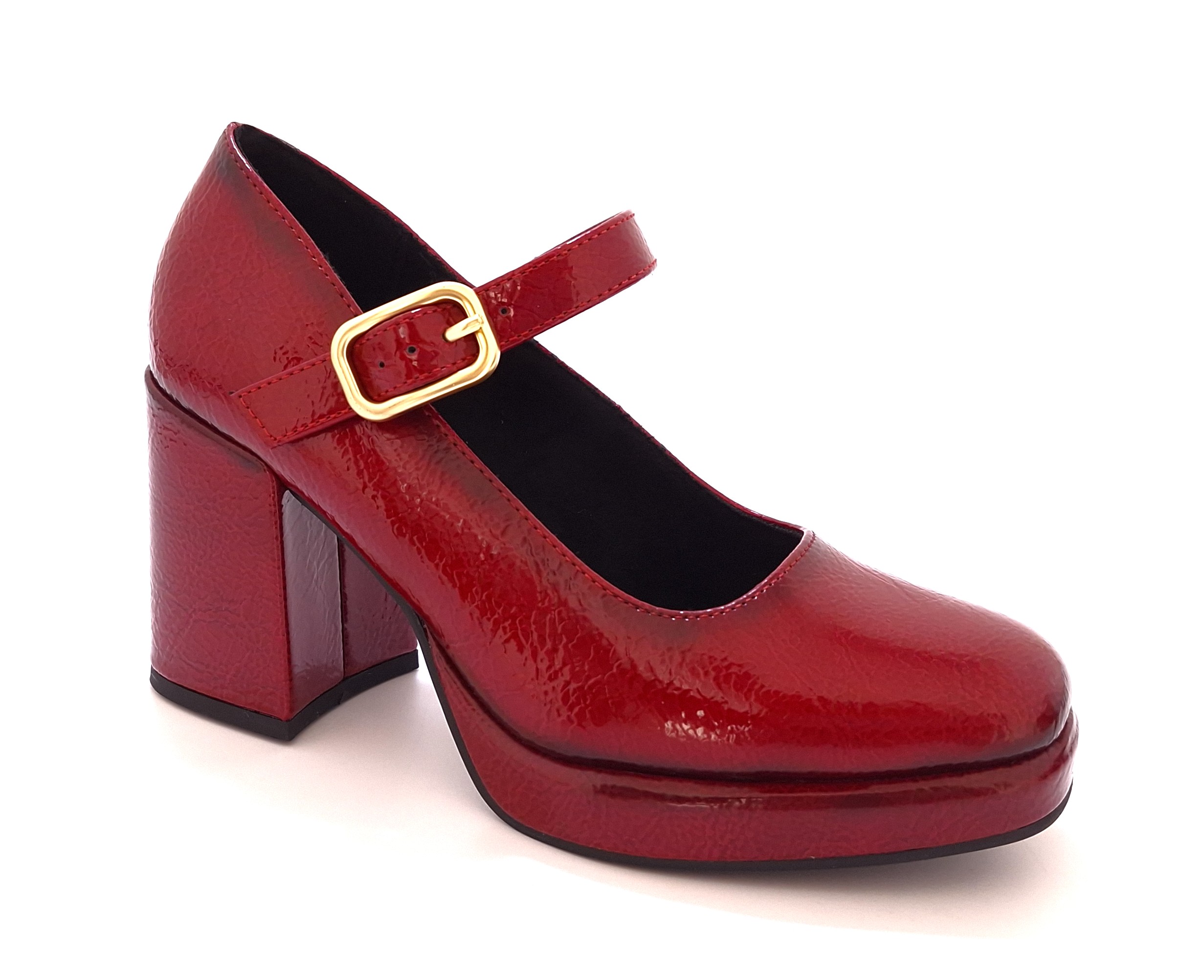 • Czółenka damskie na szerokim obcasie w stylu Mary Jane w kolorze czerwonym.