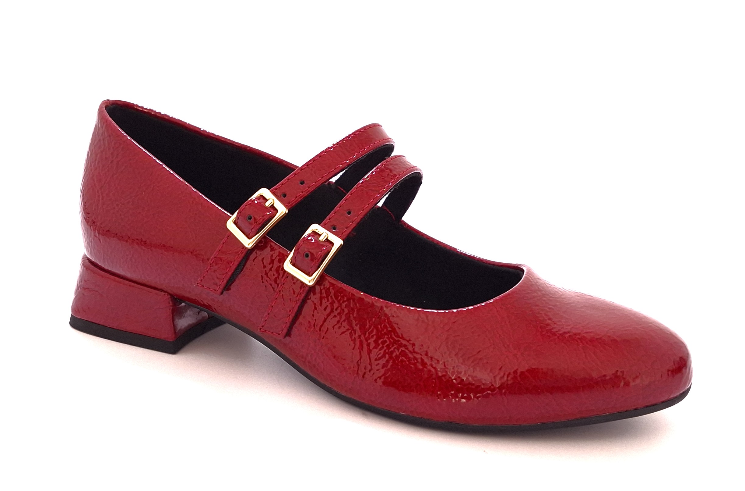 - Czerwone baleriny damskie w stylu Mary Jane.