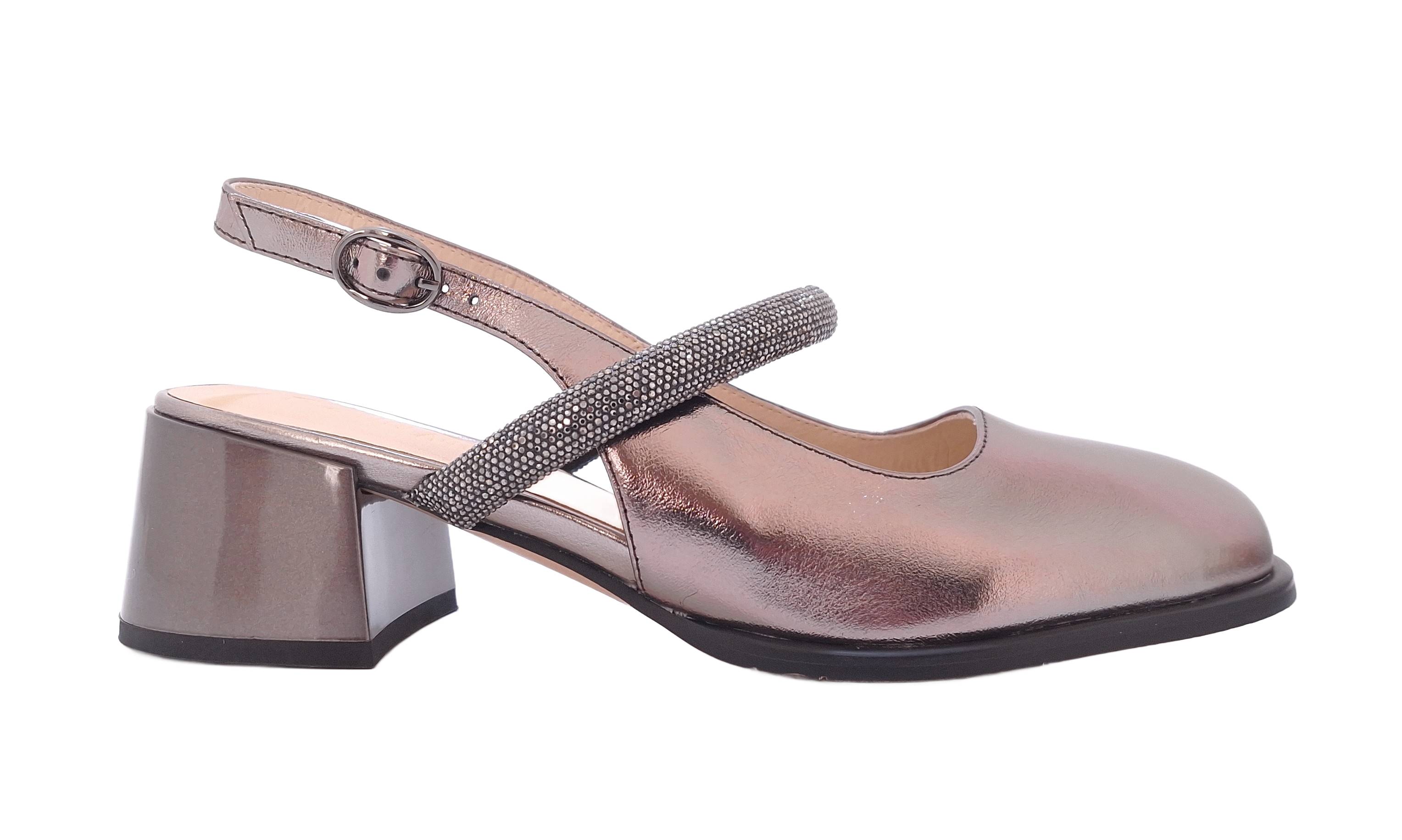 Damskie czółenka z odkrytą piętą Loretta Vitale to eleganckie obuwie, które łączy ponadczasowy styl z nowoczesnymi akcentami. Wykonane z wysokiej jakości naturalnej skóry metalizowanej, zachwycają subtelnym blaskiem. Stylowy pasek zdobiony dżetami, umieszczony na śródstopiu, nie tylko pełni funkcję dekoracyjną, ale również delikatnie podtrzymuje stopę. Boczne zapięcie na metalową sprzączkę pozwala idealnie dopasować czółenka do stopy. Niski, szeroki obcas, sprawia, że są wyjątkowo wygodne i idealne do noszenia przez cały dzień.