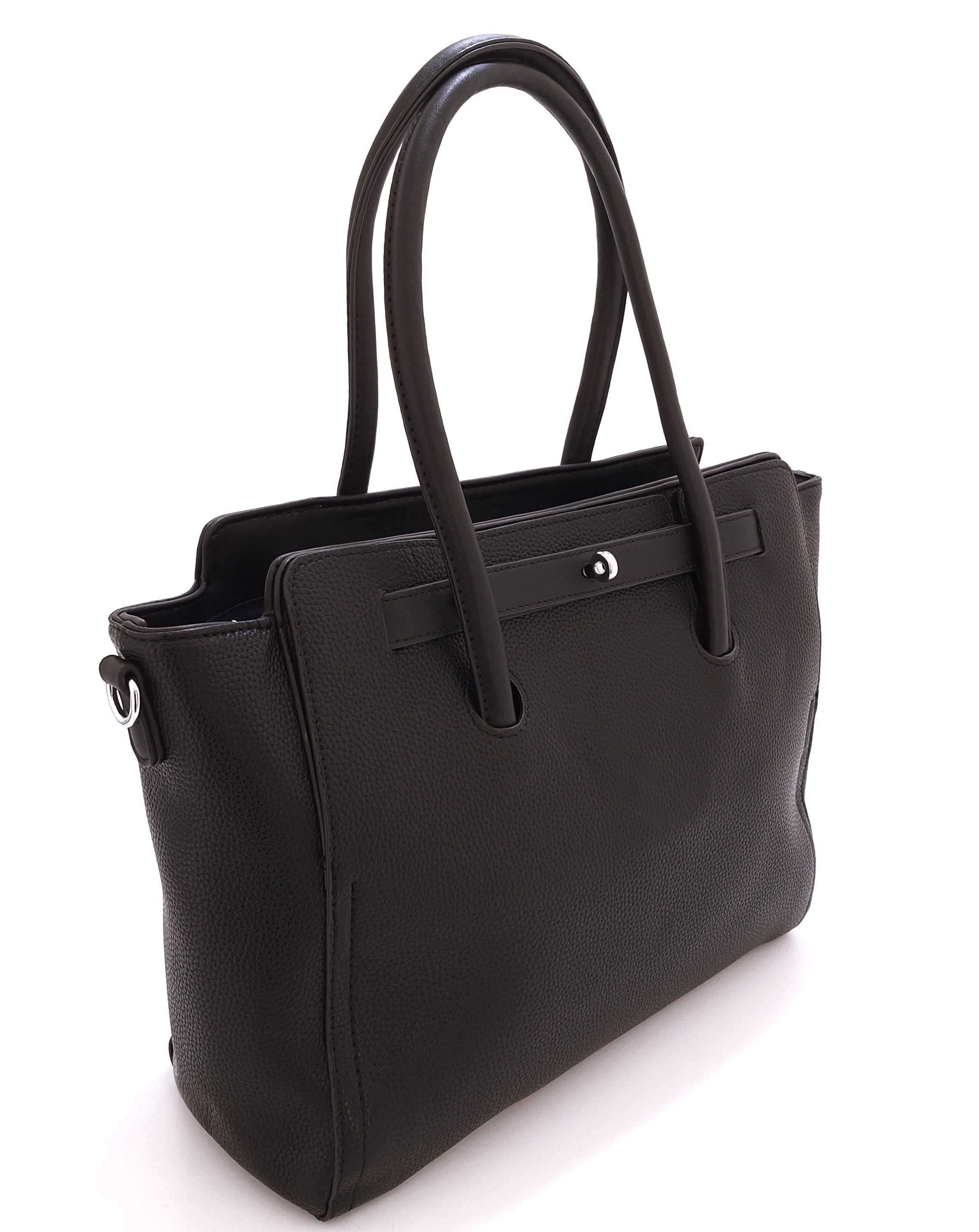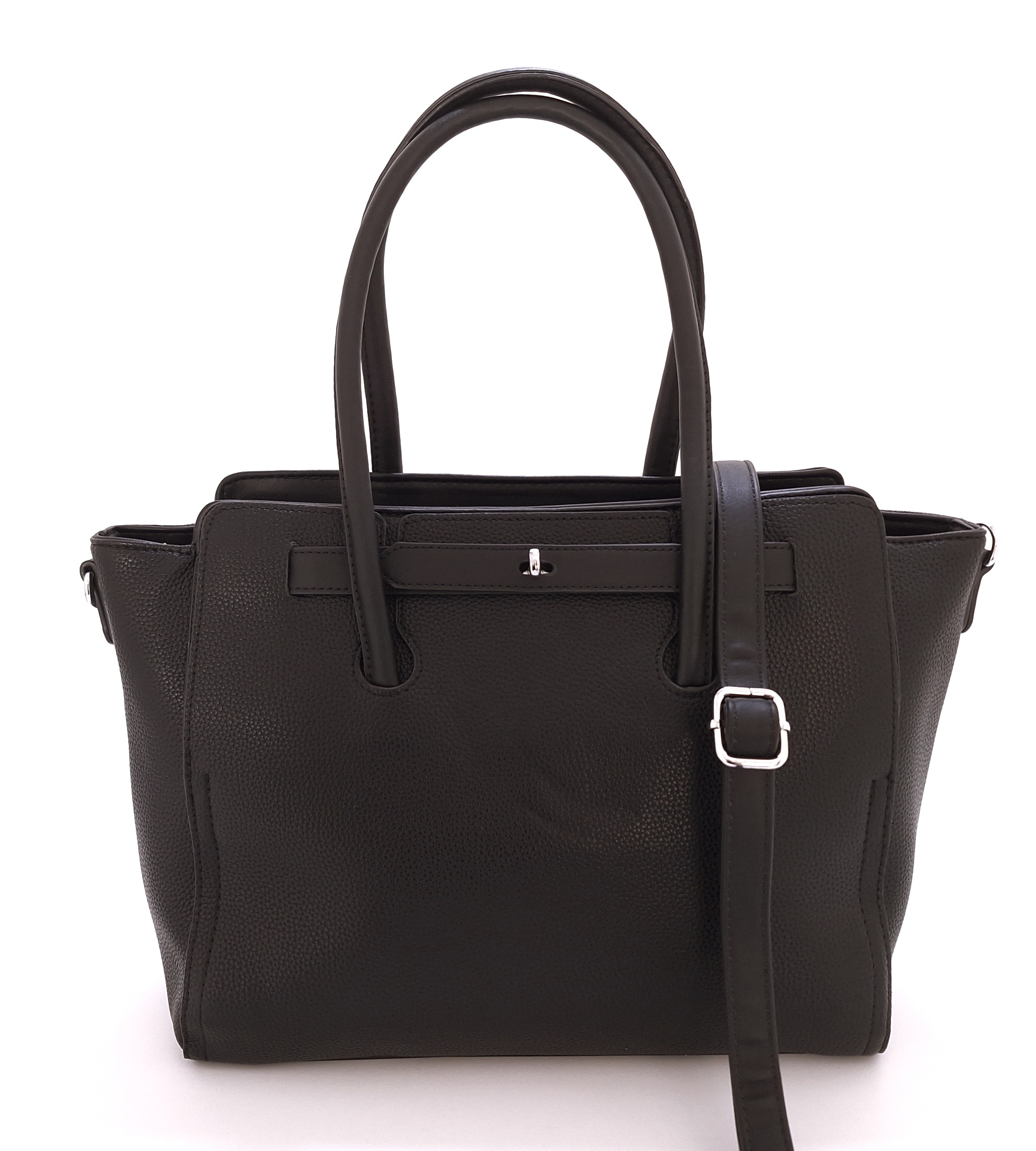 Torebka damska marki Maria C to ponadczasowy fason, który prezentuje się elegancko i gustownie. Wykonana z miękkiej ekoskóry fakturowanej we wzór groszek w czarnym kolorze. Centralnym elementem zdobniczym jest pasek z metalowym obkręcanym zamkiem, który dodaje całości wyrafinowanego charakteru i stanowi subtelny akcent biżuteryjny. Jednokomorowe wnętrze zamykane na zamek błyskawiczny. Przez środek torebki przechodzi rozpinany pasek. Dzięki niemu możesz zwężyć lub poszerzyć górną część torebki.Torebka wyposażona w wygodne uchwyty do trzymania w dłoni oraz pasek regulowany na ramię.