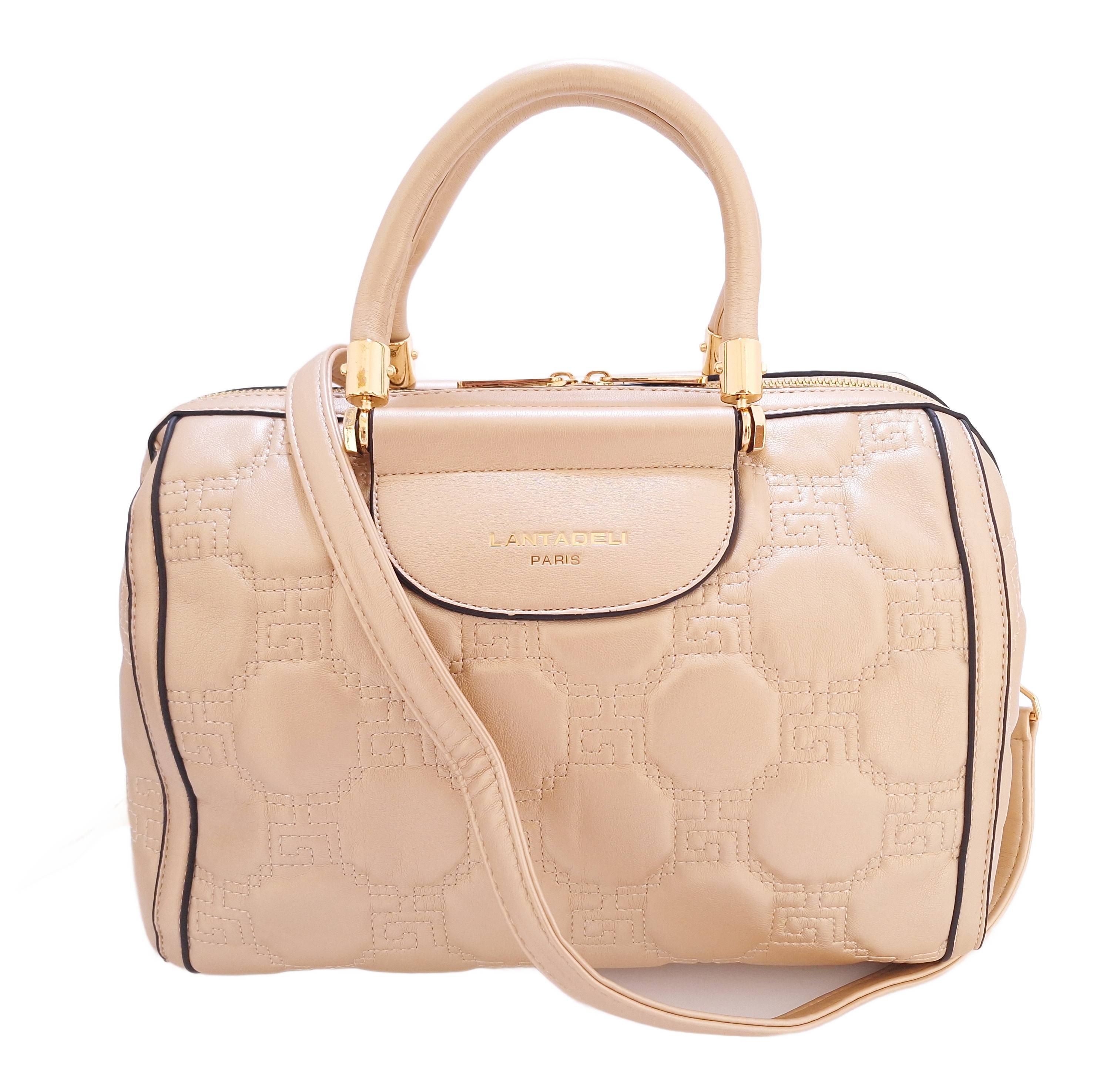 Minimalistyczna torebka damska marki Lantadeli w złotym kolorze. Wykonana z ekologicznej skóry, ozdobiona pikowanymi geometrycznymi wzorami, które dodają jej nowoczesnego charakteru. Przestrzenna konstrukcja pomieści wszystkie najpotrzebniejsze rzeczy. Kuferek wyposażony w dwie wygodne rączki oraz odpinany, regulowany pasek. Spód torebki chronią metalowe ochronne nóżki.
