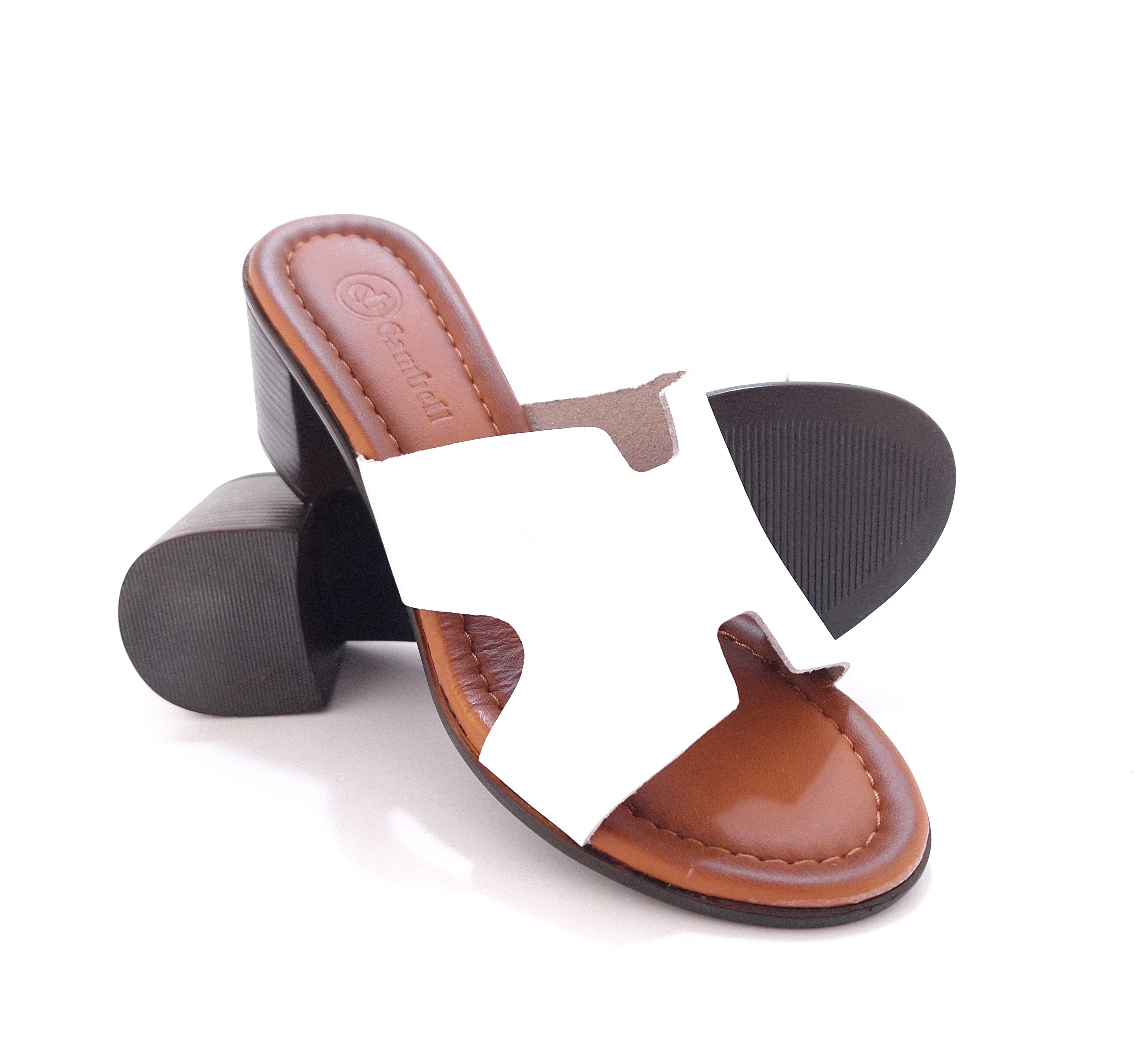 Klapki damskie na szerokim, niewysokim obcasie marki Cambell wykonane z bialej skóry naturalnej. Model wyróżnia geometryczna cholewka w kształcie litery H, która nadaje butom oryginalnego charakteru. Szeroki obcas typu słupek zapewnia stabilnosc i wygodę noszenia podczas chodzenia.