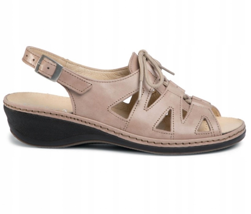 - Profilaktyczne skórzane sandały damskie. Wyjmowana wkładka ze skóry. Regulowana tęgość. Zapięcie na klamerkę.