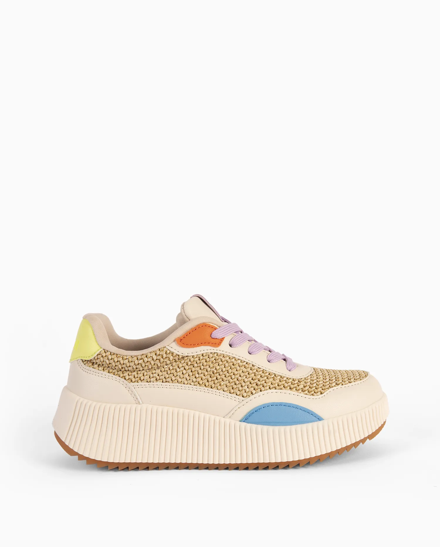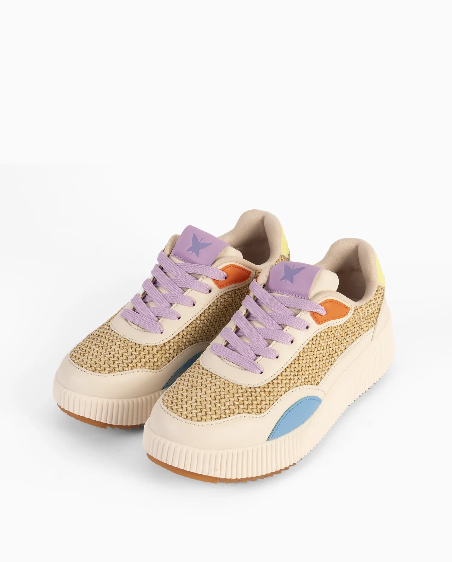 Połączenie różnych faktur syntetycznej rafii i vegańskich materiałów nadaje butom oryginalnego charakteru, a neutralne barwy sprawiają, że pasują do każdej stylizacji.