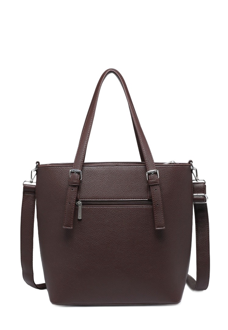 - Damska torebka w brązowym kolorze wykonana z ekologicznej skóry. Regulowane uchwyty oraz odpinany pasek umożliwiają noszenie na różne sposoby. Model jednokomorowy.