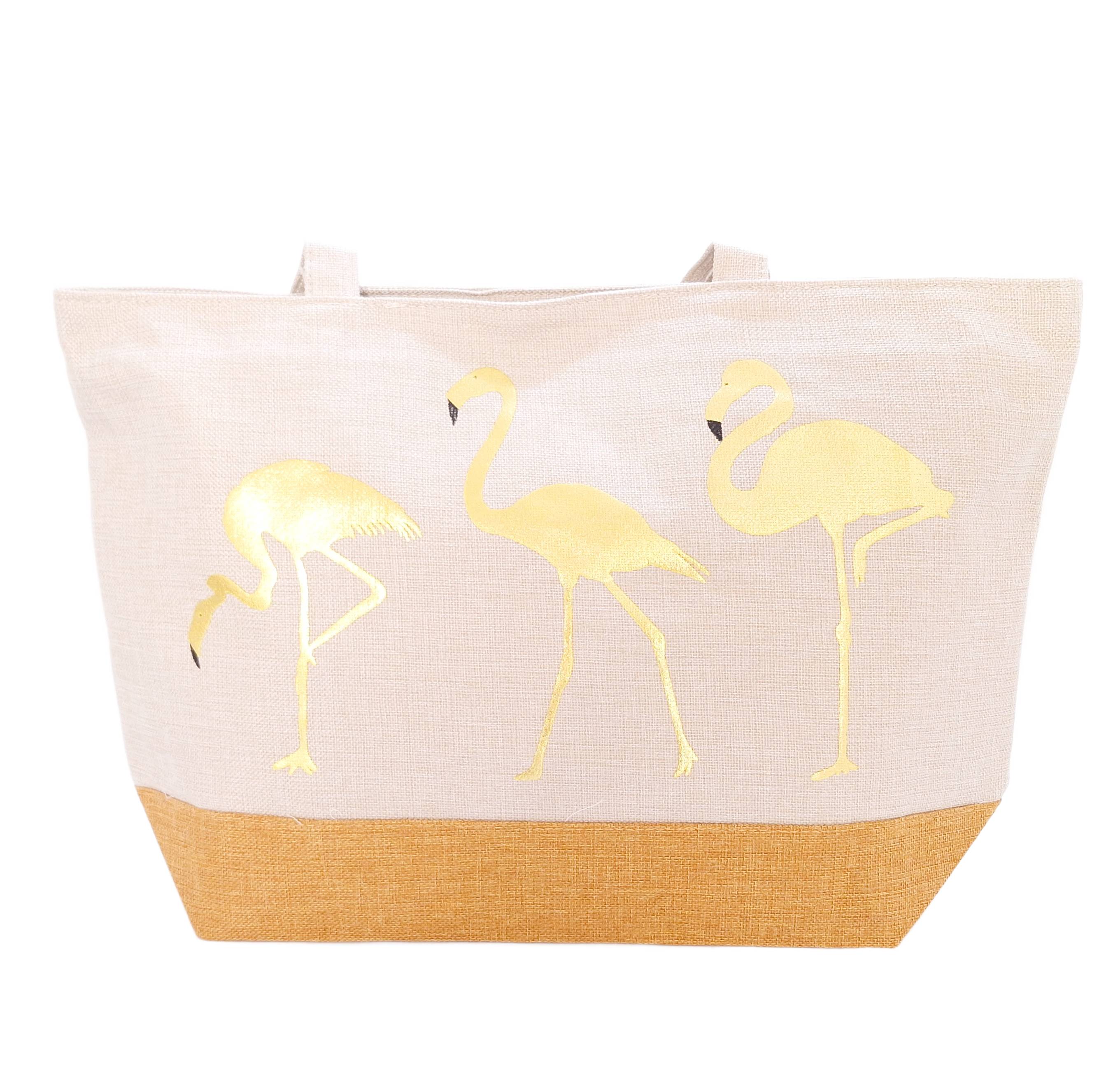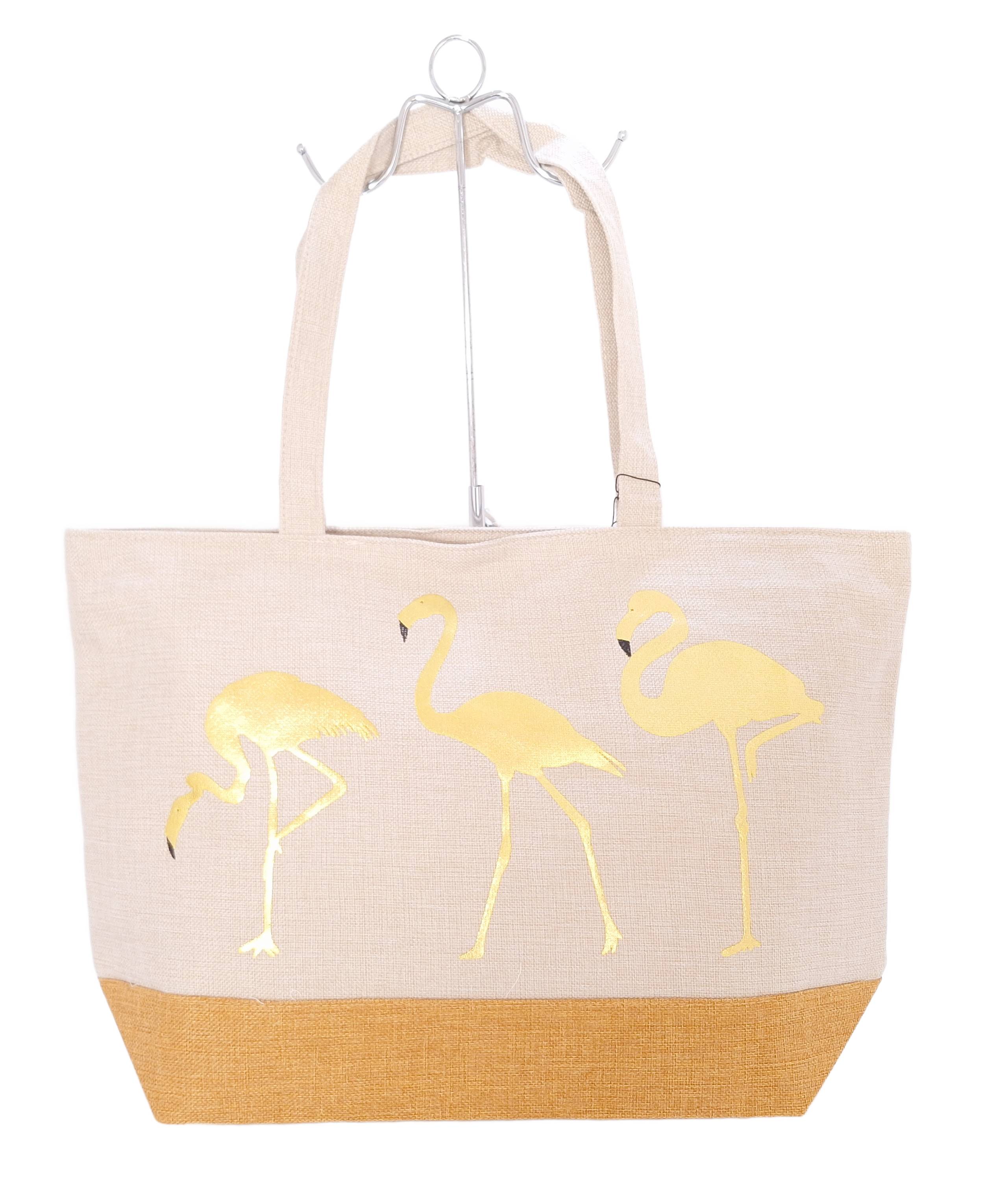 Duża, lekka torba plażowa shopper bag Bagia to idealny dodatek, który przyciąga wzrok i dopełnia letnie stylizacje. Wykonana z materiału przypominającego worek jutowy w beżowym kolorze. Front shopperki zdobi aplikacja z modnym motywem złotych flamingów. Komora zamykana na zamek błyskawiczny. Wnętrze zabezpiecza podszewka z poliestru. Bez problemu zmieści format A4, dzięki czemu sprawdzi się również jako shopperka na co dzień. Dwie wygodne rączki gwarantują komfort noszenia – zarówno w ręku, jak i na ramieniu.