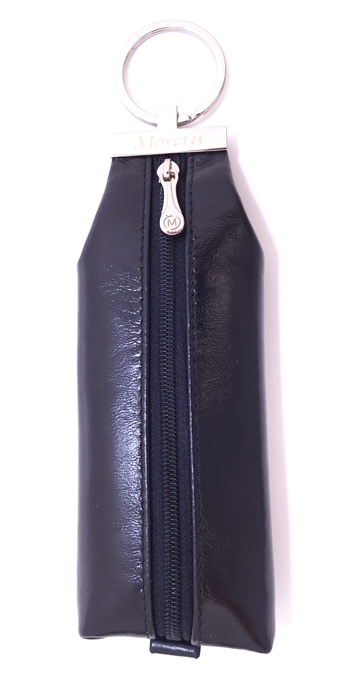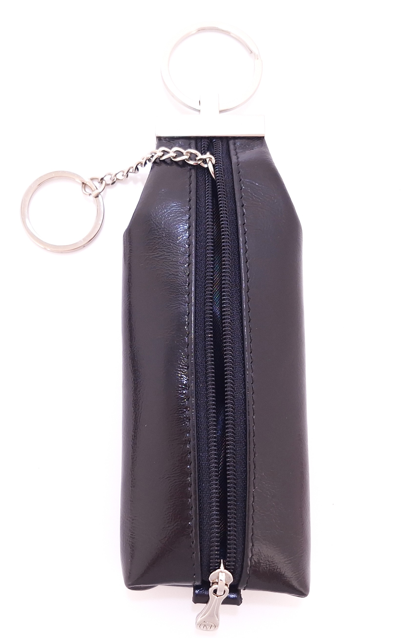 Szykowne etui na klucze marki Angela Moretti wykonane z naturalnej czarnej skóry o błyszczącym wykończeniu. Zamykane na solidny suwak, wnętrze etui zostało starannie wyściełane podszewką, która chroni zawartość przed zarysowaniami. W środku znajduje się łańcuszek z metalowym kółkiem na klucze, który utrzymuje je w jednym miejscu i ułatwia organizację. Na zewnątrz znajduje się praktyczne kółko na brelok, które umożliwia przypięcie do torebki, plecaka lub spodni