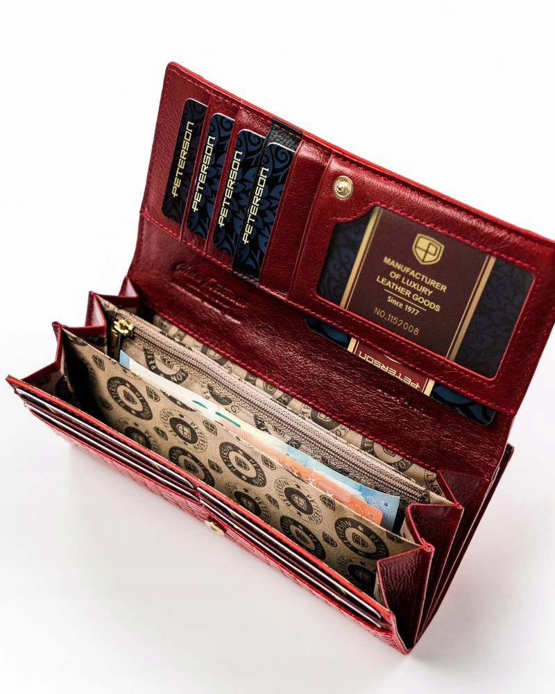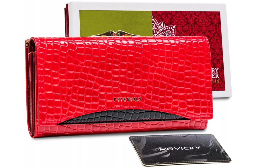 Czerwony portfel damski Peterson wykonany z lakierowanej skóry z tłoczonym wzorem imitującym skórę krokodyla prezentuje się elegancko i stylowo. Duży, poziomy format z klapką jest praktyczny i zapewnia wygode przechowywania. Wyposażony w technologię RFID, która zabezpiecza Twoje karty, dokumenty biometryczne, legitymacje, karty zbliżeniowe przed nieautoryzowanym odczytem danych.